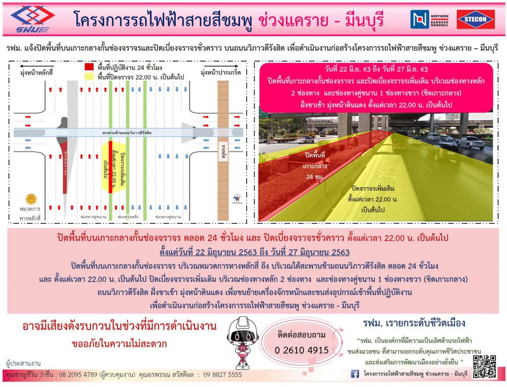 การรถไฟฟ้าขนส่งมวลชนแห่งประเทศไทย (รฟม.) แจ้งว่า บริษัท ซิโน-ไทย เอ็นจีเนียริ่ง แอนด์ คอนสตรัคชั่น จำกัด (มหาชน) ผู้รับจ้างก่อสร้างงานโยธา โครงการรถไฟฟ้าสายสีชมพู ช่วงแคราย – มีนบุรี มีความจำเป็นต้องปิดพื้นที่บนเกาะกลางกั้นช่องจราจร บริเวณหมวดการทางหลักสี่ ถึง บริเวณใต้สะพานข้ามถนนวิภาวดีรังสิต ตลอด 24 ชั่วโมง และตั้งแต่เวลา 22.00 น. เป็นต้นไป ปิดเบี่ยงจราจรเพิ่มเติม บริเวณช่องทางหลัก 2 ช่องทาง และช่องทางคู่ขนาน 1 ช่องทางขวา (ชิดเกาะกลาง) ถนนวิภาวดีรังสิต ฝั่งขาเข้า มุ่งหน้าดินแดง เพื่อขนย้ายเครื่องจักรหนักและอุปกรณ์เข้าพื้นที่ปฏิบัติงาน เพื่อดำเนินงานก่อสร้างโครงการฯ ตั้งแต่วันที่ 22 – 27 มิถุนายน 2563