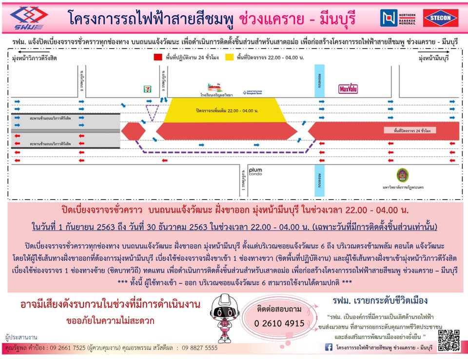 ​การรถไฟฟ้าขนส่งมวลชนแห่งประเทศไทย (รฟม.) แจ้งว่า บริษัท ซิโน-ไทย เอ็นจีเนียริ่ง แอนด์ คอนสตรัคชั่น จำกัด (มหาชน) ผู้รับจ้างก่อสร้างงานโยธา โครงการรถไฟฟ้าสายสีชมพู ช่วงแคราย – มีนบุรี มีความจำเป็นต้องปิดเบี่ยงจราจรชั่วคราวทุกช่องทาง บนถนนแจ้งวัฒนะ ฝั่งขาออก มุ่งหน้ามีนบุรี ตั้งแต่บริเวณซอยแจ้งวัฒนะ 6 ถึง บริเวณตรงข้ามพลัม คอนโด แจ้งวัฒนะ โดยให้ผู้ใช้เส้นทางฝั่งขาออกที่ต้องการมุ่งหน้ามีนบุรี เบี่ยงใช้ช่องจราจรฝั่งขาเข้า 1 ช่องทางขวา (ชิดพื้นที่ปฏิบัติงาน) และผู้ใช้เส้นทางฝั่งขาเข้าที่ต้องการมุ่งหน้าวิภาวดีรังสิต เบี่ยงใช้ช่องจราจร 1 ช่องทางซ้าย (ชิดบาทวิถี) เพื่อดำเนินการติดตั้งชิ้นส่วนเสาตอม่อ สำหรับก่อสร้างโครงการฯ วันที่ 1 กันยายน 2563 ถึง วันที่ 30 ธันวาคม 2563 ในช่วงเวลา 22.00 – 04.00 น. (เฉพาะวันที่มีการดำเนินงานติดตั้งชิ้นส่วนเท่านั้น) ทั้งนี้ ผู้ใช้ทางเข้า – ออก บริเวณซอยแจ้งวัฒนะ 6 สามารถใช้งานได้ตามปกติ