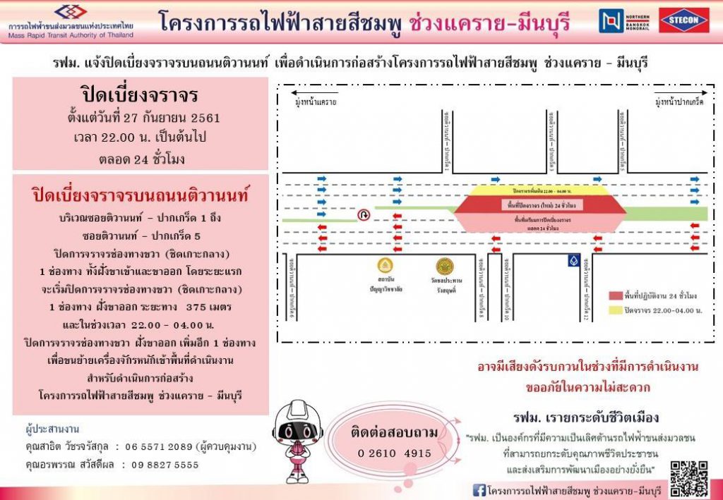 ทางโครงการฯ จะดำเนินการเข้าพื้นที่เพื่อดำเนินการก่อสร้างโครงการฯ วันที่ 27 กันยายน 2561 ตั้งแต่เวลา 22.00 น. เป็นต้นไป ทางโครงการฯ จะดำเนินการปิดช่องจราจร 1 ช่องทางขวา (ชิดเกาะกลาง) ทั้งฝั่งขาเข้าและขาออก ตลอด 24 ชั่วโมง บริเวณซอยติวานนท์ – ปากเกร็ด 1 ถึง ซอยติวานนท์ – ปากเกร็ด 5 เพื่อดำเนินการก่อสร้างโครงการฯ