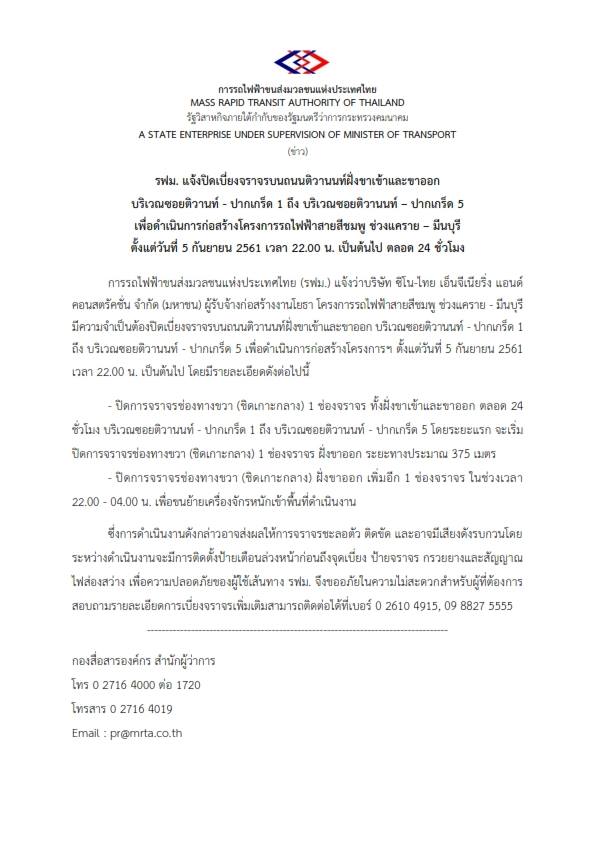 การรถไฟฟ้าขนส่งมวลชนแห่งประเทศไทย (รฟม.) แจ้งว่า บริษัท ซิโน-ไทย เอ็นจีเนียริ่ง แอนด์ คอนสตรัคชั่น จำกัด (มหาชน) ผู้รับจ้างก่อสร้างงานโยธา โครงการรถไฟฟ้าสายสีชมพู ช่วงแคราย – มีนบุรี มีความจำเป็นต้องปิดเบี่ยงจราจรบนถนนติวานนท์ ฝั่งขาเข้าและขาออก บริเวณซอยติวานนท์ – ปากเกร็ด 1 ถึง บริเวณซอยติวานนท์ – ปากเกร็ด 5 เพื่อดำเนินการก่อสร้างโครงการฯ ตั้งแต่วันที่ 5 กันยายน 2561 เป็นต้นไป โดยมีรายละเอียดดังต่อไปนี้