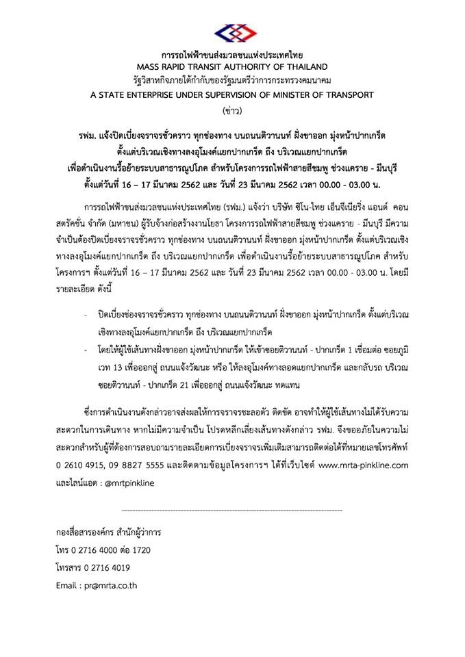 การรถไฟฟ้าขนส่งมวลชนแห่งประเทศไทย (รฟม.) แจ้งว่า บริษัท ซิโน-ไทย เอ็นจีเนียริ่ง แอนด์ คอนสตรัคชั่น จำกัด (มหาชน) ผู้รับจ้างก่อสร้างงานโยธา โครงการรถไฟฟ้าสายสีชมพู ช่วงแคราย – มีนบุรี มีความจำเป็นต้องปิดเบี่ยงจราจรชั่วคราว ทุกช่องทาง บนถนนติวานนท์ ฝั่งขาออก มุ่งหน้าปากเกร็ด ตั้งแต่บริเวณเชิงทางลงอุโมงค์แยกปากเกร็ด ถึง บริเวณแยกปากเกร็ด เพื่อดำเนินงานรื้อย้ายระบบสาธารณูปโภค สำหรับโครงการฯ ตั้งแต่วันที่ 16 – 17 มีนาคม 2562 และ วันที่ 23 มีนาคม 2562 เวลา 00.00 – 03.00 น. โดยมีรายละเอียด ดังนี้