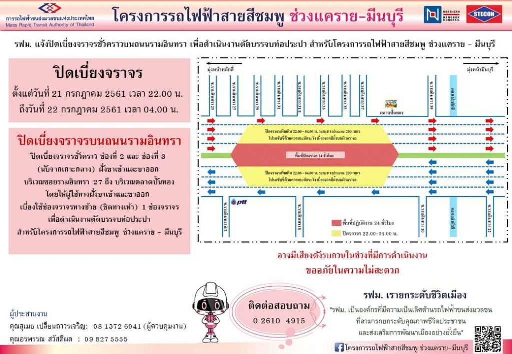 การรถไฟฟ้าขนส่งมวลชนแห่งประเทศไทย (รฟม.) แจ้งว่า บริษัท ซิโน-ไทย เอ็นจีเนียริ่ง แอนด์ คอนสตรัคชั่น จำกัด (มหาชน) ผู้รับจ้างก่อสร้างงานโยธา โครงการรถไฟฟ้าสายสีชมพู ช่วงแคราย – มีนบุรี มีความจำเป็นต้องปิดเบี่ยงจราจรชั่วคราวบนถนนรามอินทรา ฝั่งขาเข้าและขาออก บริเวณซอยรามอินทรา 27 ถึง บริเวณตลาดปั้นทอง ระยะทาง 200 เมตร เพื่อดำเนินงานตัดบรรจบท่อประปาของโครงการฯ ในวันที่ 21 กรกฎาคม 2561 เวลา 22.00 น. ถึง วันที่ 22 กรกฎาคม 2561 เวลา 04.00 น. โดยมีรายละเอียดดังต่อไปนี้