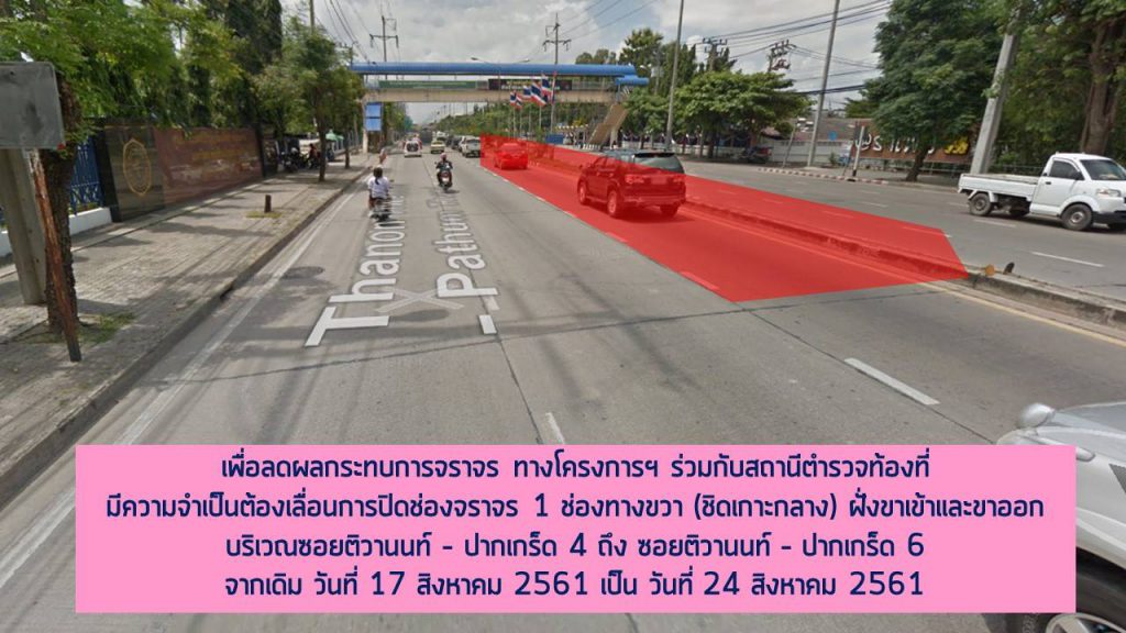 เพื่อลดผลกระทบการจราจร ทางโครงการฯ ร่วมกับสถานีตำรวจท้องที่ มีความจำเป็นต้องเลื่อนการปิดช่องจราจร 1 ช่องทางขวา (ชิดเกาะกลาง) ฝั่งขาเข้าและขาออก บนถนนติวานนท์ บริเวณซอยติวานนท์ – ปากเกร็ด 4 ถึง ซอยติวานนท์ – ปากเกร็ด 6 จากเดิมวันที่ 17 สิงหาคม 2561 เป็น วันที่ 24 สิงหาคม 2561 เพื่อดำเนินการก่อสร้างรถไฟฟ้าสายสีชมพู ช่วงแคราย – มีนบุรี ขออภัยในความไม่สะดวกด้วยนะคะ