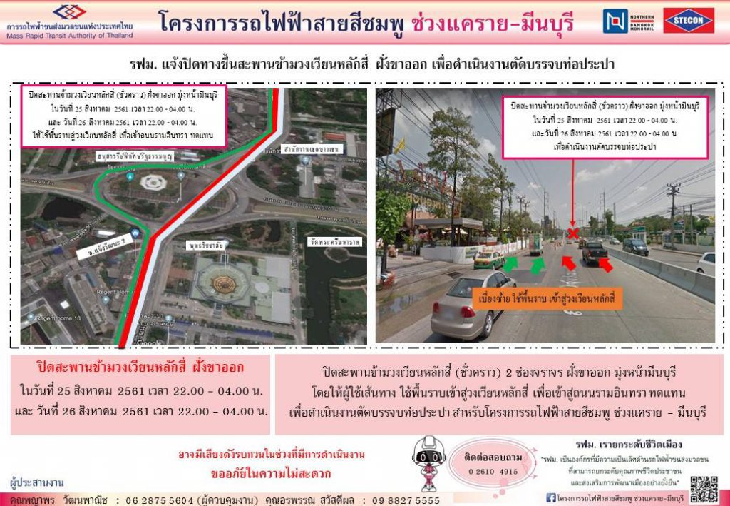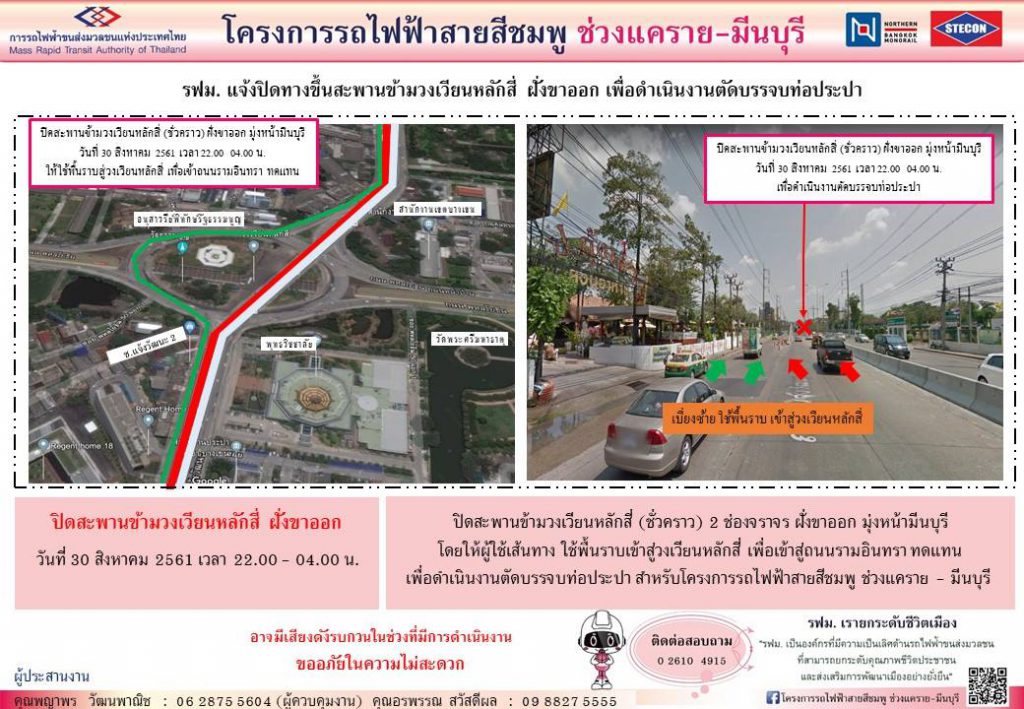เพื่อลดผลกระทบด้านการจราจร ทางโครงการฯ ร่วมกับสถานีตำรวจท้องที่ มีความจำเป็นต้องเลื่อนการปิดสะพานข้ามวงเวียนหลักสี่ (ชั่วคราว) ฝั่งขาออก มุ่งหน้ามีนบุรี จากเดิม วันที่ 25 สิงหาคม เวลา 22.00 – 04.00 น. และ วันที่ 26 สิงหาคม 2561 เวลา 22.00 – 04.00 น. เป็น วันที่ 30 สิงหาคม 2561 เวลา 22.00 – 04.00 น. ทั้งนี้ให้ผู้ใช้ทางใช้พื้นราบเข้าสู่วงเวียนหลักสี่ เพื่อเข้าสู่ถนนรามอินทรา ทดแทน