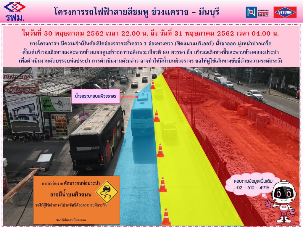 ในวันที่ 30 พฤษภาคม 2562 เวลา 22.00 น. ถึง วันที่ 31 พฤษภาคม 2562 เวลา 04.00 น. ทางโครงการฯ มีความจำเป็นต้องปิดช่องจราจรชั่วคราว 1 ช่องทางขวา (ชิดแนวแบริเออร์) ฝั่งขาออก มุ่งหน้าปากเกร็ด ตั้งแต่บริเวณเชิงทางลงสะพานข้ามแยกศูนย์ราชการเฉลิมพระเกียรติ 80 พรรษา ถึง บริเวณเชิงทางขึ้นสะพานข้ามคลองประปา เพื่อดำเนินงานตัดบรรจบท่อประปา