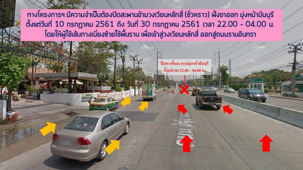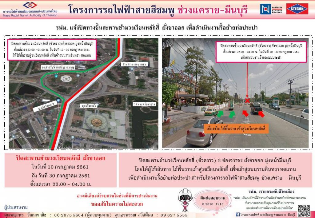 ตั้งแต่วันที่ 10 กรกฎาคม 2561 ถึง วันที่ 30 กรกฎาคม 2561 เวลา 22.00 – 04.00 น. ทางโครงการฯ มีความจำเป็นต้องปิดสะพานข้ามวงเวียนหลักสี่ (ชั่วคราว) ฝั่งขาออก มุ่งหน้ามีนบุรี โดยผู้ใช้เส้นทาง กรุณาใช้พื้นราบ เพื่อเข้าสู่วงเวียนหลักสี่ ออกสู่ถนนรามอินทรา ทดแทน เพื่อดำเนินงานรื้อย้ายท่อประปา สำหรับโครงการฯ และหลังจากเวลา 04.00 น. เป็นต้นไป สามารถใช้งานสะพานข้ามวงเวียนหลักสี่ได้ตามปกติค่ะ ทั้งนี้ต้องขออภัยในความไม่สะดวก และฝากผู้ใช้เส้นทางชะลอความเร็ว เพื่อเตรียมเบี่ยงจราจรเข้าสู่พื้นราบด้วยนะคะ