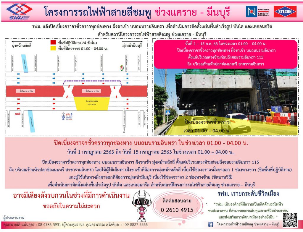 การรถไฟฟ้าขนส่งมวลชนแห่งประเทศไทย (รฟม.) แจ้งว่า บริษัท ซิโน-ไทย เอ็นจีเนียริ่ง แอนด์ คอนสตรัคชั่น จำกัด (มหาชน) ผู้รับจ้างก่อสร้างงานโยธา โครงการรถไฟฟ้าสายสีชมพู ช่วงแคราย – มีนบุรี มีความจำเป็นต้องปิดเบี่ยงจราจรชั่วคราวทุกช่องทาง บนถนนรามอินทรา ฝั่งขาเข้าและฝั่งขาออก ตั้งแต่บริเวณถัดจากซอยรามอินทรา 113 ถึง บริเวณถัดจากซอยรามอินทรา 115 เพื่อดำเนินการติดตั้งแผ่นพื้นสำเร็จรูป บันได และเทคอนกรีต สำหรับสถานีโครงการฯ วันที่ 1 – 15 กรกฎาคม 2563 ในช่วงเวลา 22.00 – 04.00 น.