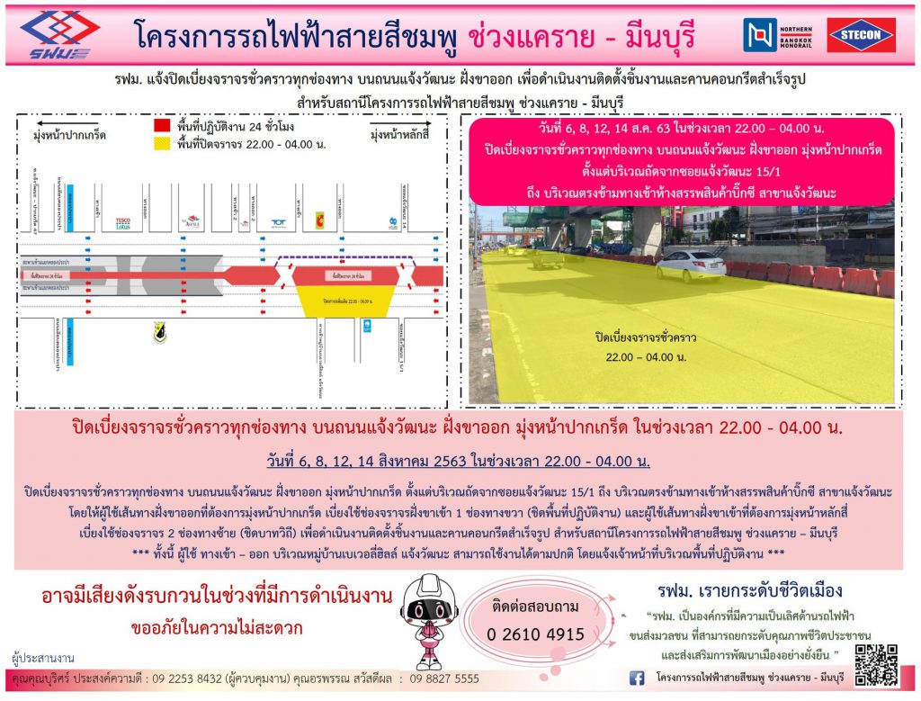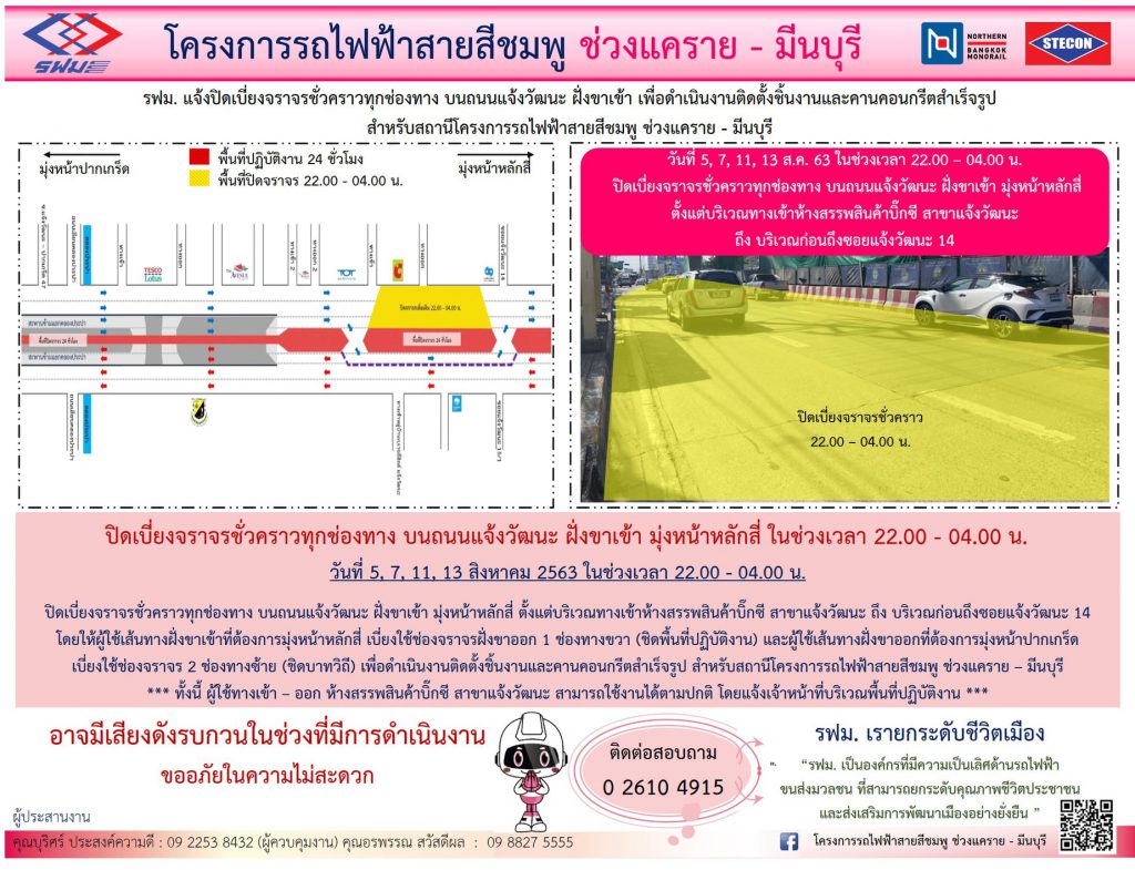 การรถไฟฟ้าขนส่งมวลชนแห่งประเทศไทย (รฟม.) แจ้งว่า บริษัท ซิโน-ไทย เอ็นจีเนียริ่ง แอนด์ คอนสตรัคชั่น จำกัด (มหาชน) ผู้รับจ้างก่อสร้างงานโยธา โครงการรถไฟฟ้าสายสีชมพู ช่วงแคราย – มีนบุรี มีความจำเป็นต้องปิดเบี่ยงจราจรชั่วคราวทุกช่องทาง บนถนนแจ้งวัฒนะ ฝั่งขาเข้าและฝั่งขาออก ตั้งแต่บริเวณทางเข้าห้างสรรพสินค้าบิ๊กซี สาขาแจ้งวัฒนะ ถึง บริเวณก่อนถึงซอยแจ้งวัฒนะ 14 เพื่อดำเนินการติดตั้งชิ้นงานและคานคอนกรีตสำเร็จรูป สำหรับสถานีโครงการฯ วันที่ 5 – 14 สิงหาคม 2563 ในช่วงเวลา 22.00 – 04.00 น. โดยมีรายละเอียดดังนี้
