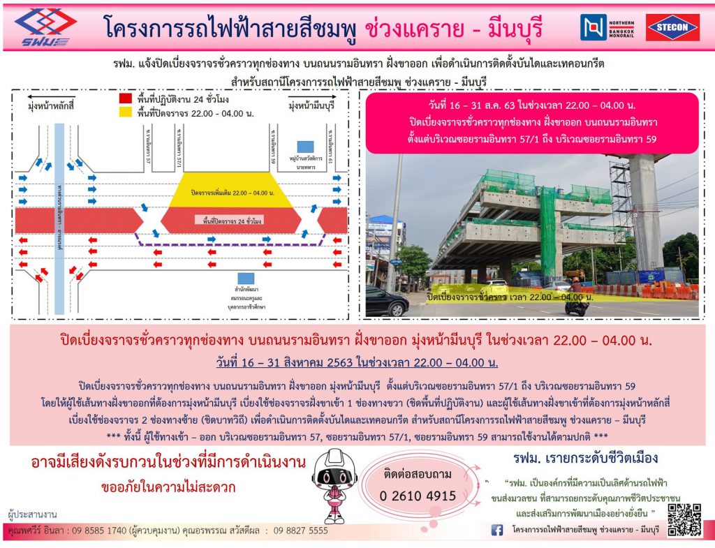 การรถไฟฟ้าขนส่งมวลชนแห่งประเทศไทย (รฟม.) แจ้งว่า บริษัท ซิโน-ไทย เอ็นจีเนียริ่ง แอนด์ คอนสตรัคชั่น จำกัด (มหาชน) ผู้รับจ้างก่อสร้างงานโยธา โครงการรถไฟฟ้าสายสีชมพู ช่วงแคราย – มีนบุรี มีความจำเป็นต้องปิดเบี่ยงจราจรชั่วคราวทุกช่องทาง บนถนนรามอินทรา ฝั่งขาเข้าและฝั่งขาออก ตั้งแต่บริเวณตรงข้ามซอยรามอินทรา 59 ถึง บริเวณตรงข้ามซอยรามอินทรา 57/1 เพื่อดำเนินการติดตั้งบันไดและเทคอนกรีต สำหรับสถานีโครงการฯ วันที่ 9 – 31 สิงหาคม 2563 ในช่วงเวลา 22.00 – 04.00 น. โดยมีรายละเอียด ดังนี้