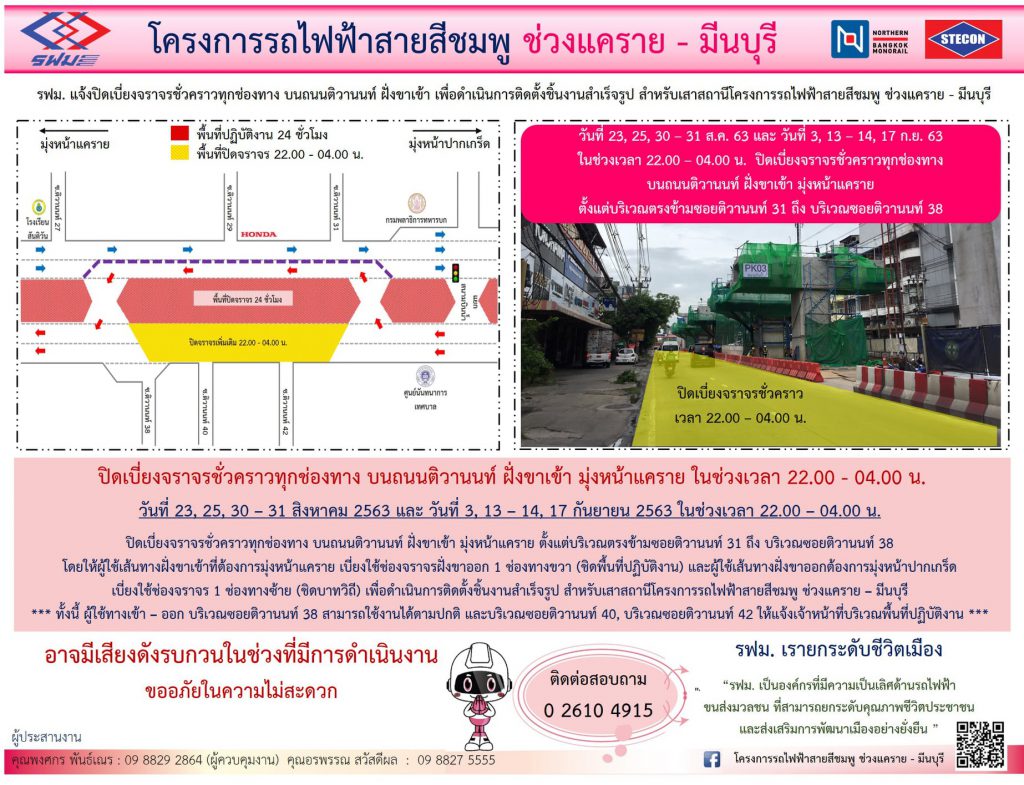 การรถไฟฟ้าขนส่งมวลชนแห่งประเทศไทย (รฟม.) แจ้งว่า บริษัท ซิโน-ไทย เอ็นจีเนียริ่ง แอนด์ คอนสตรัคชั่น จำกัด (มหาชน) ผู้รับจ้างก่อสร้างงานโยธา โครงการรถไฟฟ้าสายสีชมพู ช่วงแคราย – มีนบุรี มีความจำเป็นต้องปิดเบี่ยงจราจรชั่วคราวทุกช่องทาง บนถนนติวานนท์ ฝั่งขาเข้าและฝั่งขาออก ตั้งแต่บริเวณตรงข้ามซอยติวานนท์ 38 ถึง บริเวณซอยติวานนท์ 31 เพื่อดำเนินการติดตั้งชิ้นงานสำเร็จรูป สำหรับเสาสถานีโครงการฯ วันที่ 22 – 25, 29 – 31 สิงหาคม 2563 และ วันที่ 1, 3, 12 – 15, 17 กันยายน 2563 ในช่วงเวลา 22.00 – 04.00 น. โดยมีรายละเอียด ดังนี้