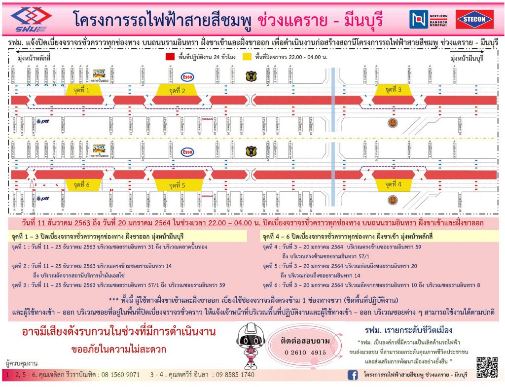 การรถไฟฟ้าขนส่งมวลชนแห่งประเทศไทย (รฟม.) แจ้งว่า บริษัท ซิโน-ไทย เอ็นจีเนียริ่ง แอนด์ คอนสตรัคชั่น จำกัด (มหาชน) ผู้รับจ้างก่อสร้างงานโยธา โครงการรถไฟฟ้าสายสีชมพู ช่วงแคราย – มีนบุรี มีความจำเป็นต้องปิดเบี่ยงจราจรชั่วคราวทุกช่องทาง บนรามอินทรา ฝั่งขาเข้าและฝั่งขาออก ตั้งแต่บริเวณซอยรามอินทรา 33 ถึง บริเวณซอยรามอินทรา 59 เพื่อดำเนินงานก่อสร้างสถานีโครงการฯ วันที่ 11 ธันวาคม 2563 ถึง วันที่ 20 มกราคม 2564 ในช่วงเวลา 22.00 – 04.00 น. โดยมีรายละเอียด ดังนี้