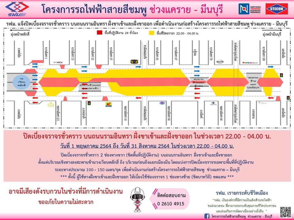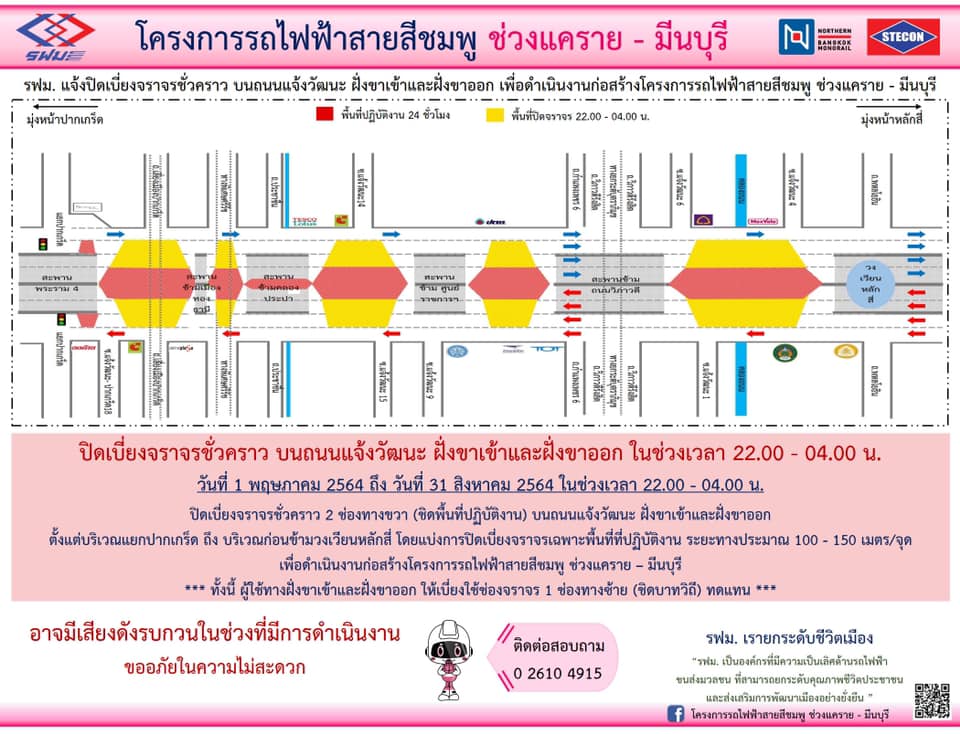 การรถไฟฟ้าขนส่งมวลชนแห่งประเทศไทย (รฟม.) แจ้งว่า บริษัท ซิโน-ไทย เอ็นจีเนียริ่ง แอนด์ คอนสตรัคชั่น จำกัด (มหาชน) ผู้รับจ้างก่อสร้างงานโยธา โครงการรถไฟฟ้าสายสีชมพู ช่วงแคราย – มีนบุรี มีความจำเป็นต้องปิดเบี่ยงจราจรชั่วคราว บนถนนติวานนท์ ถนนแจ้งวัฒนะ และถนนรามอินทรา ฝั่งขาเข้าและฝั่งขาออก ตั้งแต่บริเวณแยกแคราย ถึง บริเวณก่อนถึงแยกเมืองมีน เพื่อดำเนินงานก่อสร้างโครงการฯ วันที่ 1 พฤษภาคม 2564 ถึง วันที่ 31 สิงหาคม 2564 ในช่วงเวลา 22.00 – 04.00 น. โดยมีรายละเอียดดังนี้