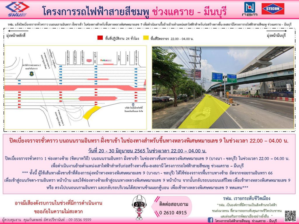 การรถไฟฟ้าขนส่งมวลชนแห่งประเทศไทย (รฟม.) แจ้งว่า บริษัท ซิโน-ไทย เอ็นจีเนียริ่ง แอนด์ คอนสตรัคชั่น จำกัด (มหาชน) ผู้รับจ้างก่อสร้างงานโยธา โครงการรถไฟฟ้าสายสีชมพู ช่วงแคราย – มีนบุรี มีความจำเป็นต้องปิดเบี่ยงจราจรชั่วคราว 1 ช่องทางซ้าย (ชิดบาทวิถี) บนถนนรามอินทรา ฝั่งขาเข้า ในช่องทางขึ้นทางหลวงพิเศษหมายเลข 9 (บางนา – ชลบุรี) เพื่อดำเนินงานย้ายตำแหน่งเสาไฟฟ้าสำหรับก่อสร้างทางขึ้น – ลงสถานีโครงการรถไฟฟ้าสายสีชมพู ช่วงแคราย – มีนบุรี วันที่ 20 – 30 มิถุนายน 2565 ในช่วงเวลา 22.00 – 04.00 น. ทั้งนี้ ผู้ใช้เส้นทางฝั่งขาเข้าที่ต้องการมุ่งหน้าทางหลวงพิเศษหมายเลข 9 (บางนา – ชลบุรี) ให้ใช้ช่องจราจรพื้นราบทางซ้าย ถัดจากซอยรามอินทรา 66 เพื่อเข้าสู่ถนนรัชดา – รามอินทรา หน้าบ้าน และใช้ช่องทางซ้ายเข้าสู่ถนนทางหลวงพิเศษหมายเลข 9 หน้าบ้าน จากนั้นกลับรถบนถนนเสรีไทย เพื่อเข้าทางหลวงพิเศษหมายเลข 9 หรือ ตรงไปบนถนนรามอินทรา และกลับรถบริเวณใต้สะพานข้ามแยกคู้บอน เพื่อเข้าทางหลวงพิเศษหมายเลข 9 ทดแทน