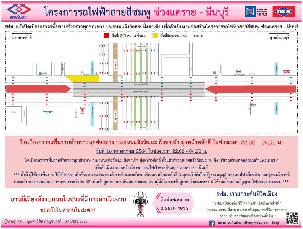 ​การรถไฟฟ้าขนส่งมวลชนแห่งประเทศไทย (รฟม.) แจ้งว่า บริษัท ซิโน-ไทย เอ็นจีเนียริ่ง แอนด์ คอนสตรัคชั่น จำกัด (มหาชน) ผู้รับจ้างก่อสร้างงานโยธา โครงการรถไฟฟ้าสายสีชมพู ช่วงแคราย – มีนบุรี มีความจำเป็นต้องปิดเบี่ยงพื้นราบชั่วคราวทุกช่องทาง บนถนนแจ้งวัฒนะ ฝั่งขาเข้า มุ่งหน้าหลักสี่ ตั้งแต่บริเวณซอยแจ้งวัฒนะ 10 ถึง บริเวณก่อนออกสู่ถนนกำแพงเพชร 6 เพื่อก่อสร้างโครงารฯ ในวันที่ 16 พฤษภาคม 2564 ในช่วงเวลา 22.00 – 04.00 น. ทั้งนี้ ผู้ใช้ทางพื้นราบ ให้เบี่ยงขวาเพื่อขึ้นสะพานข้ามถนนวิภาวดี และกลับรถบริเวณวงเวียนหลักสี่ (อนุสาวรีย์พิทักษรัฐธรรมนูญ) และตรงไป เลี้ยวซ้ายออกสู่ถนนวิภาวดี และกลับรถ บริเวณถัดจากซอยวิภาวดีรังสิต 62 เพื่อเข้าสู่ถนนวิภาวดีรังสิต ทดแทน ส่วนผู้ที่ต้องการเข้าสู่ถนกำแพงเพชร 6 ให้รอเลี้ยวตามสัญญาณไฟจราจร ทดแทน