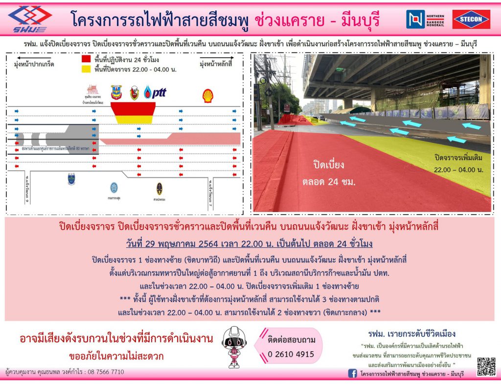 การรถไฟฟ้าขนส่งมวลชนแห่งประเทศไทย (รฟม.) แจ้งว่า บริษัท ซิโน-ไทย เอ็นจีเนียริ่ง แอนด์ คอนสตรัคชั่น จำกัด (มหาชน) ผู้รับจ้างก่อสร้างงานโยธา โครงการรถไฟฟ้าสายสีชมพู ช่วงแคราย – มีนบุรี มีความจำเป็นต้องปิดเบี่ยงจราจร ปิดเบี่ยงจราจรชั่วคราวและปิดพื้นที่เวนคืน บนถนนแจ้งวัฒนะ ฝั่งขาเข้า มุ่งหน้าหลักสี่ ตั้งแต่บริเวณกรมทหารปืนใหญ่ต่อสู้อากาศยานที่ 1 ถึง บริเวณสถานีบริการก๊าซและน้ำมัน ปตท. ในวันที่ 29 พฤษภาคม 2564 เวลา 22.00 น. เป็นต้นไป ตลอด 24 ชั่วโมง และในช่วงเวลา 22.00 – 04.00 น. ปิดเบี่ยงจราจรเพิ่มเติม 1 ช่องทางซ้าย สำหรับขนย้ายวัสดุและเครื่องจักรเข้าพื้นที่ปฏิบัติงาน เพื่อก่อสร้างสถานีโครงการฯ ทั้งนี้ ผู้ใช้ทางฝั่งขาออกที่ต้องการมุ่งหน้าปากเกร็ด สามารถใช้งานได้ 3 ช่องทางตามปกติ และในช่วงเวลา 22.00 – 04.00 น. สามารถใช้งานได้ 2 ช่องทางขวา (ชิดเกาะกลาง)