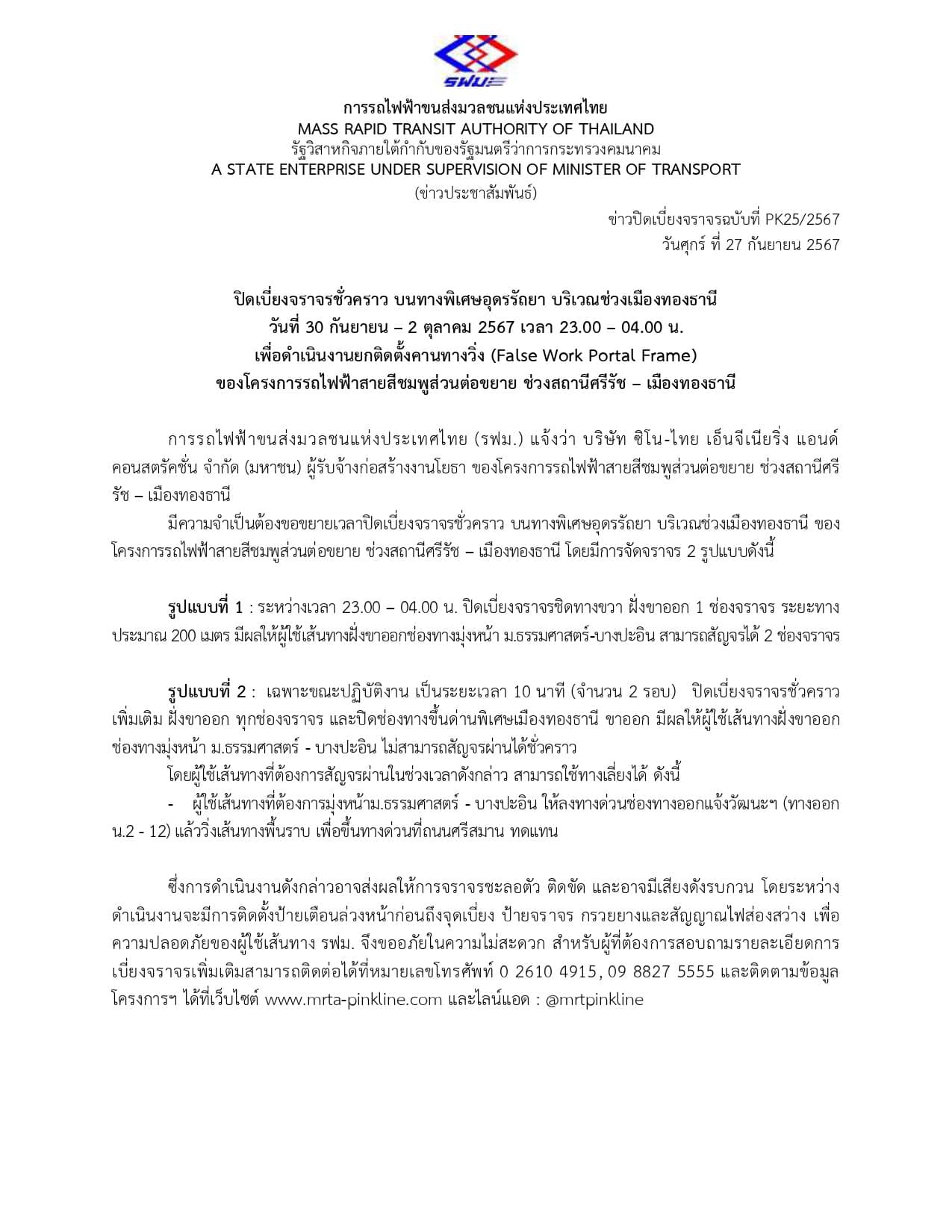 การรถไฟฟ้าขนส่งมวลชนแห่งประเทศไทย (รฟม.) แจ้งว่า บริษัท ซิโน-ไทย เอ็นจีเนียริ่ง แอนด์ คอนสตรัคชั่น จำกัด (มหาชน) ผู้รับจ้างก่อสร้างงานโยธา ของโครงการรถไฟฟ้าสายสีชมพูส่วนต่อขยาย ช่วงสถานีศรีรัช – เมืองทองธานี มีความจำเป็นต้องขอขยายเวลาปิดเบี่ยงจราจรชั่วคราว บนทางพิเศษอุดรรัถยา บริเวณช่วงเมืองทองธานี ของโครงการรถไฟฟ้าสายสีชมพูส่วนต่อขยาย ช่วงสถานีศรีรัช – เมืองทองธานี โดยมีการจัดจราจร 2 รูปแบบดังนี้