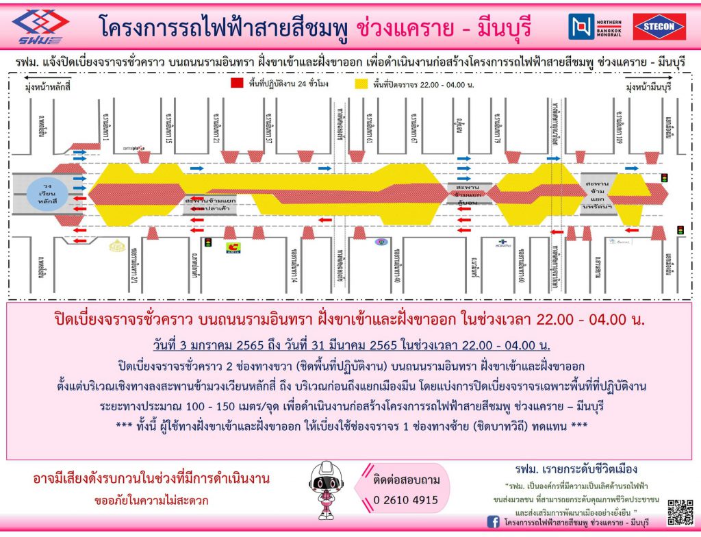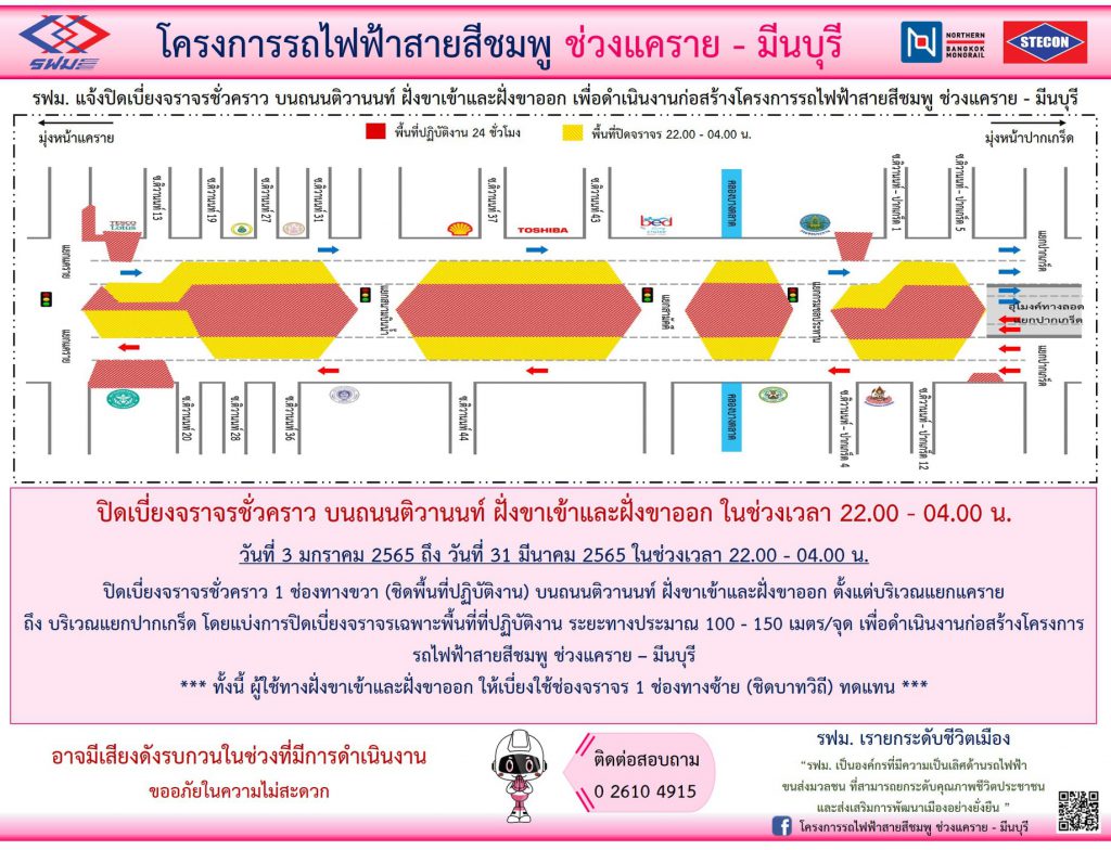การรถไฟฟ้าขนส่งมวลชนแห่งประเทศไทย (รฟม.) แจ้งว่า บริษัท ซิโน-ไทย เอ็นจีเนียริ่ง แอนด์ คอนสตรัคชั่น จำกัด (มหาชน) ผู้รับจ้างก่อสร้างงานโยธา โครงการรถไฟฟ้าสายสีชมพู ช่วงแคราย – มีนบุรี มีความจำเป็นต้องปิดเบี่ยงจราจรชั่วคราว บนถนนติวานนท์ ถนนแจ้งวัฒนะ และถนนรามอินทรา ฝั่งขาเข้าและฝั่งขาออก ตั้งแต่บริเวณแยกแคราย ถึง บริเวณก่อนถึงแยกเมืองมีน เพื่อดำเนินงานก่อสร้างโครงการฯ วันที่ 3 มกราคม 2565 ถึง วันที่ 31 มีนาคม 2565 ในช่วงเวลา 22.00 – 04.00 น. โดยมีรายละเอียดดังนี้