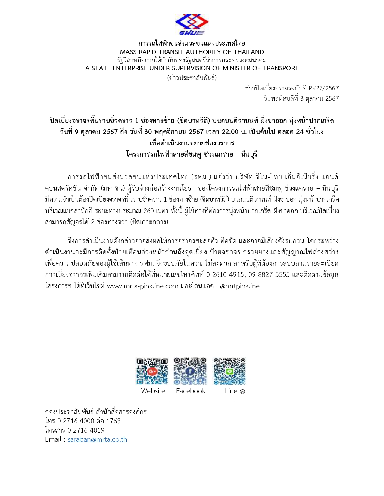 สำหรับผู้ที่ต้องการสอบถามรายละเอียดการเบี่ยงจราจรเพิ่มเติมสามารถติดต่อได้ที่