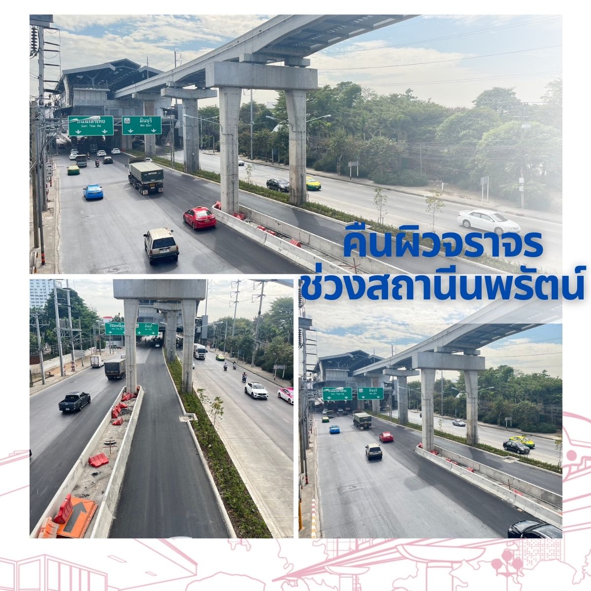 คืนผิวจราจร คืนผิวจราจร โครงการรถไฟฟ้ามหานคร สายสีชมพู ช่วงแคราย-มีนบุรี ได้ดำเนินการคืนผิวจราจร ช่วงสถานีนพรัตน์ บนถนนรามอินทรา ฝั่งขาเข้าและฝั่งขาออก ปัจจุบันผู้ใช้เส้นทางบนถนนรามอินทรา สามารถสัญจรได้ 4 ช่องทาง ทั้งฝั่งขาเข้าและฝั่งขาออก