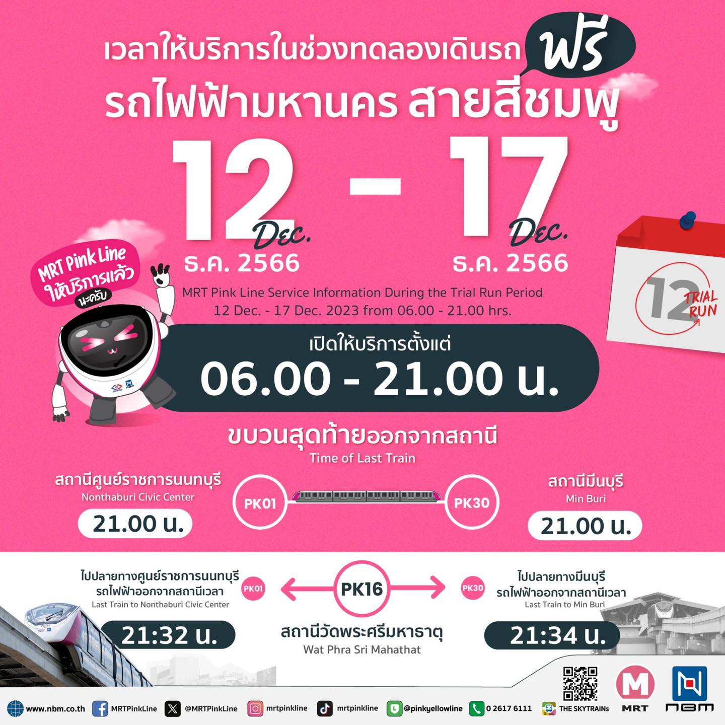 🕕 เวลาให้บริการในช่วงทดลองเดินรถฟรี! รถไฟฟ้ามหานคร สายสีชมพู ให้บริการฟรีตลอดเส้นทาง ถึง 2 ม.ค. 2567