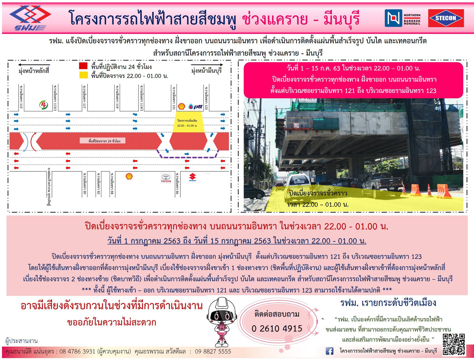 ปิดเบี่ยงจราจรชั่วคราวทุกช่องทาง บนถนนรามอินทรา ฝั่งขาเข้าและฝั่งขาออก ตั้งแต่บริเวณซอยรามอินทรา 121 ถึง บริเวณซอยรามอินทรา 123 เพื่อดำเนินการติดตั้งแผ่นพื้นสำเร็จรูป บันได และเทคอนกรีต วันที่ 1 – 15 กรกฎาคม 2563 เวลา 22.00 – 04.00 น.