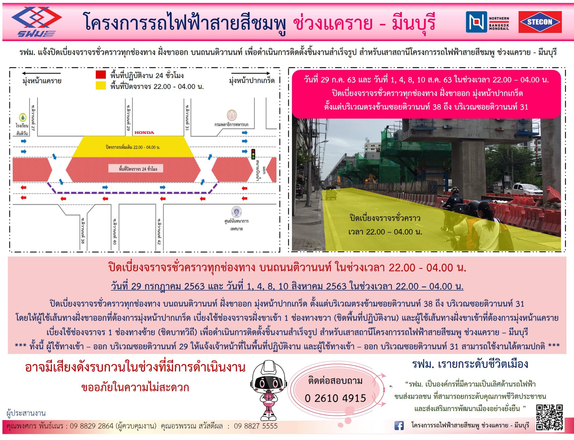 ปิดเบี่ยงจราจรชั่วคราวทุกช่องทาง บนถนนติวานนท์ ฝั่งขาเข้าและฝั่งขาออก บริเวณตรงข้ามซอยติวานนท์ 38 ถึง บริเวณซอยติวานนท์ 31 เพื่อดำเนินการติดตั้งชิ้นงานสำเร็จรูป สำหรับเสาสถานีวันที่ 29 กรกฎาคม 2563 ถึง วันที่ 11 สิงหาคม 2563 เวลา 22.00 – 04.00 น.