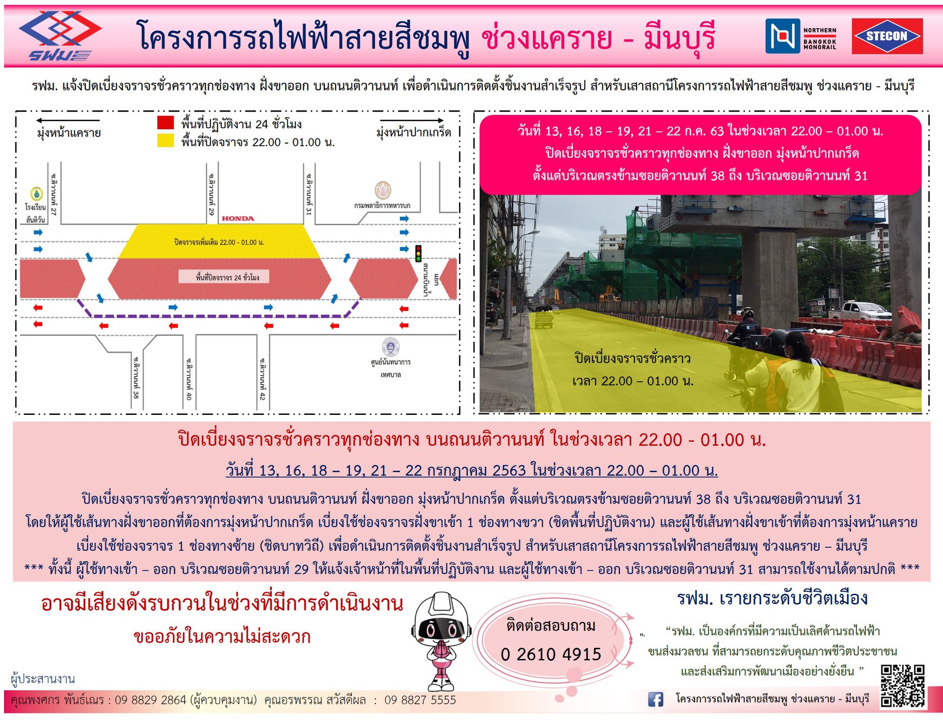 ปิดเบี่ยงจราจรชั่วคราวทุกช่องทาง บนถนนติวานนท์ ฝั่งขาเข้าและฝั่งขาออก บริเวณตรงข้ามซอยติวานนท์ 38 ถึง บริเวณซอยติวานนท์ 31 เพื่อดำเนินการติดตั้งชิ้นงานสำเร็จรูปสำหรับเสาสถานีวันที่ 13, 16, 18 – 19, 21 – 22 กรกฎาคม 2563 เวลา 22.00 – 04.00 น.
