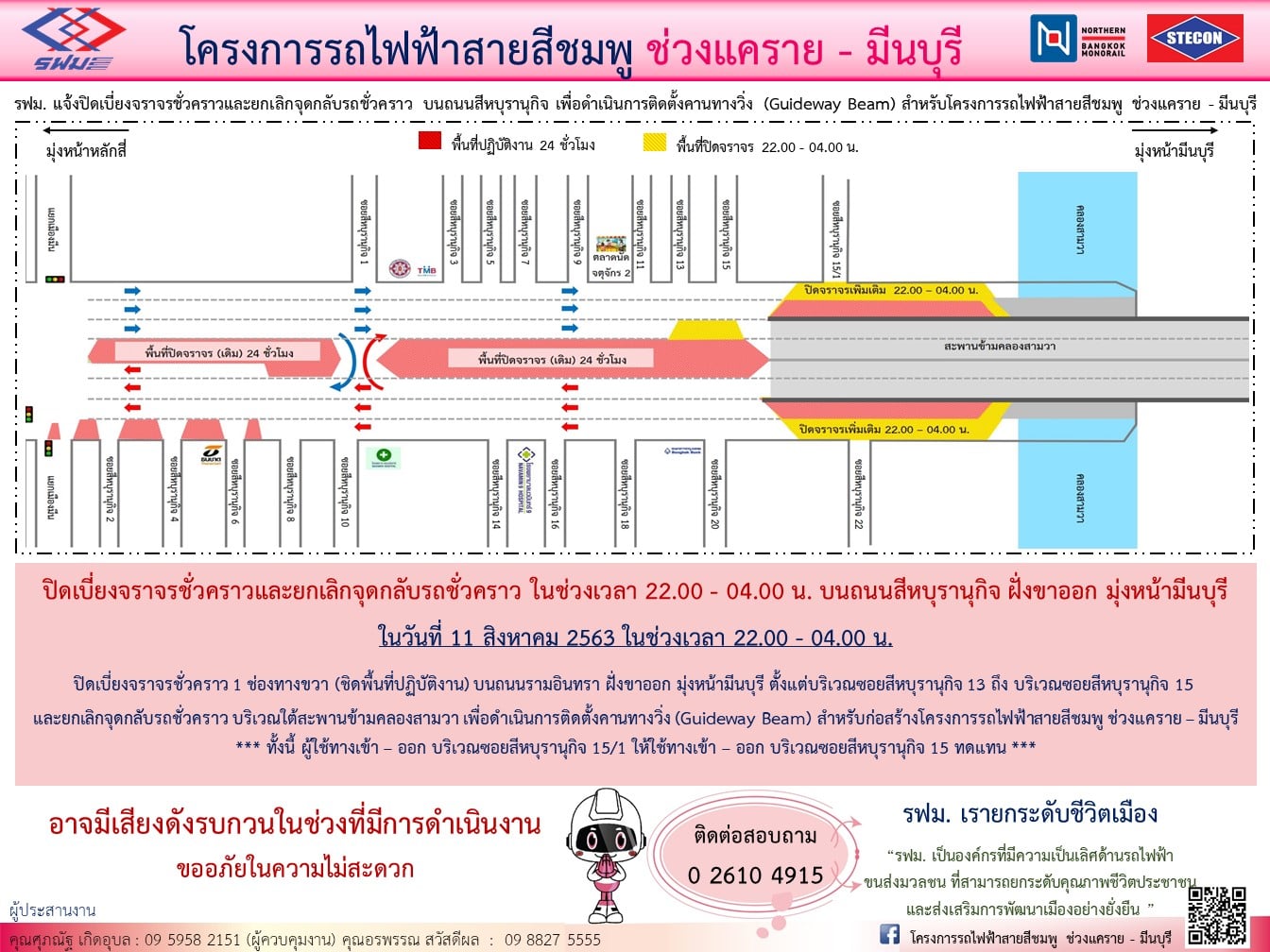 ปิดเบี่ยงจราจรชั่วคราว บนถนนสีหบุรานุกิจ ฝั่งขาออก มุ่งหน้ามีนบุรี บริเวณซอยสีหบุรานุกิจ 13 ถึง บริเวณซอยสีหบุรานุกิจ 15 และยกเลิกจุดกลับรถชั่วคราว บริเวณใต้สะพานข้ามคลองสามวา เพื่อดำเนินงานติดตั้งคานทางวิ่ง (Guideway Beam) วันที่ 11 สิงหาคม 2563 เวลา 22.00 – 04.00 น.