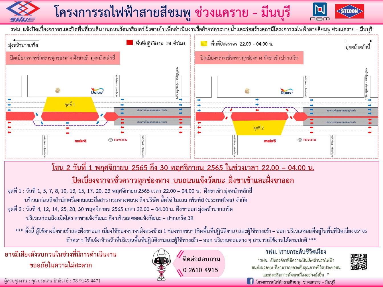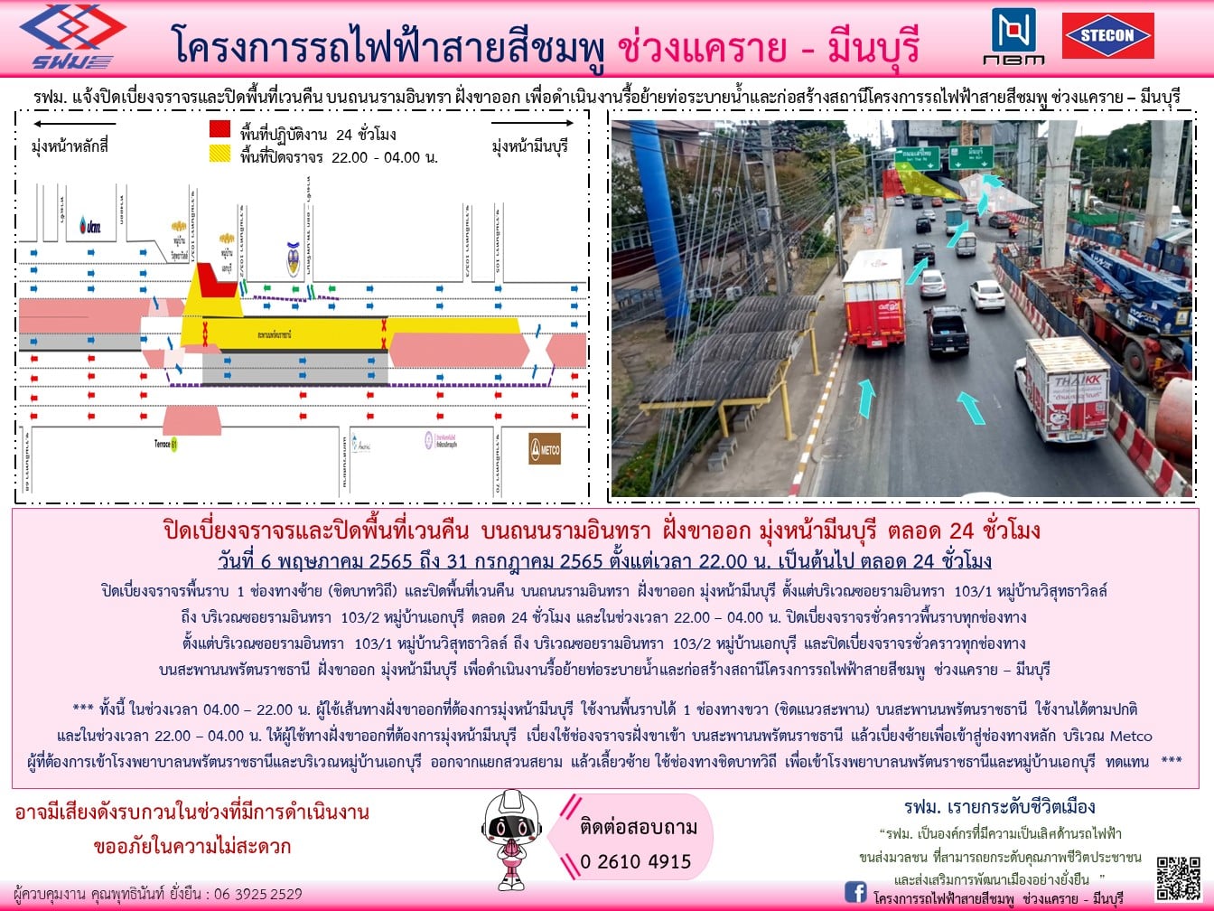 ปิดเบี่ยงจราจรชั่วคราว บนถนนรามอินทรา ฝั่งขาเข้า ในช่องทางสำหรับขึ้นทางหลวงพิเศษหมายเลข 9 วันที่ 20 – 30 มิถุนายน 2565 เวลา 22.00 – 04.00 น. เพื่อดำเนินงานย้ายตำแหน่งเสาไฟฟ้าสำหรับก่อสร้างทางขึ้น – ลงสถานี