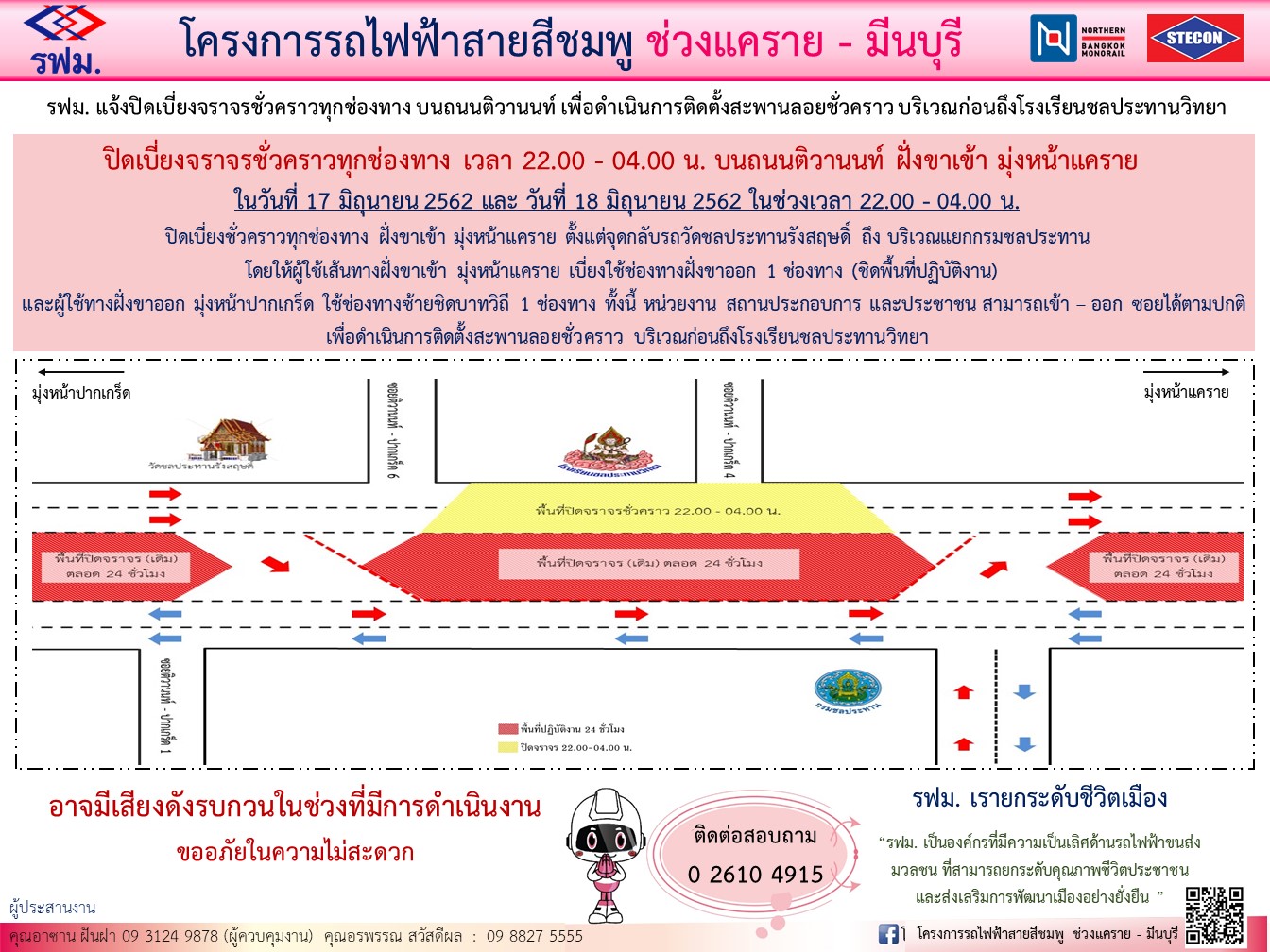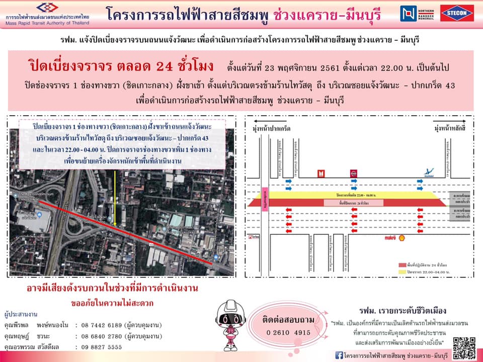 รฟม. แจ้งปิดเบี่ยงจราจรพื้นราบ ยกเลิกจุดกลับรถและห้ามเลี้ยวขวาชั่วคราว บนถนนแจ้งวัฒนะ ตั้งแต่บริเวณเชิงทางขึ้นสะพานข้ามแยกศูนย์ราชการเฉลิมพระเกียรติ ถึง บริเวณสถานีบริการน้ำมันเอสโซ่ เพื่อดำเนินงานรื้อย้ายระบบสาธารณูปโภค สำหรับโครงการรถไฟฟ้าสายสีชมพู ช่วงแคราย – มีนบุรี ตั้งแต่วันที่ 27 มีนาคม 2562 ถึง วันที่ 31 กรกฎาคม 2562 เวลา 22.00 – 04.00 น.