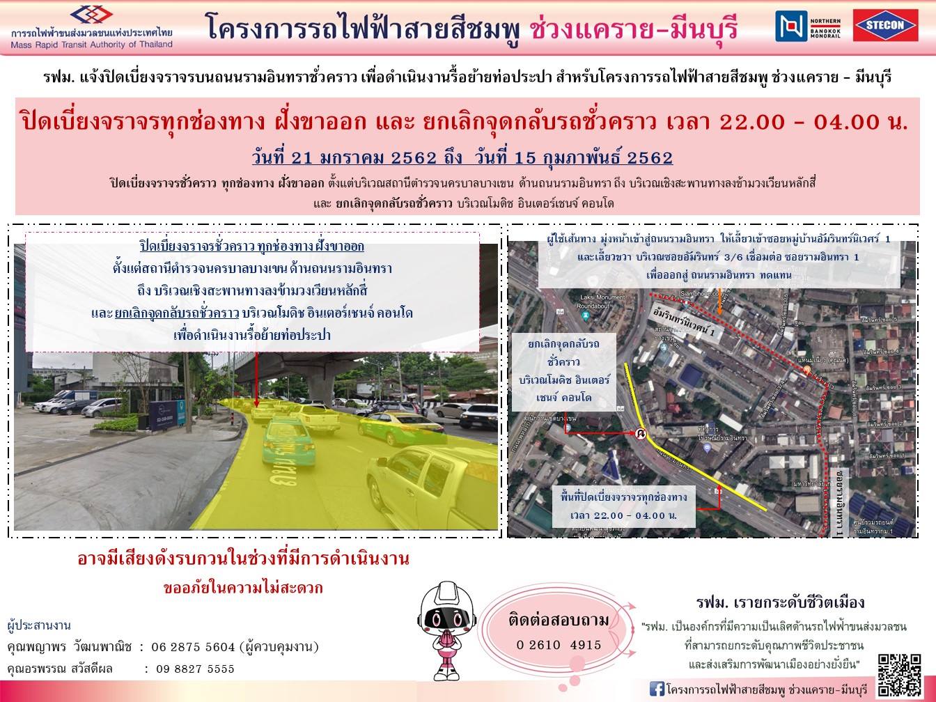 รฟม. แจ้งปิดเบี่ยงช่องจราจรชั่วคราว ทุกช่องทาง บนถนนรามอินทรา ฝั่งขาออก ตั้งแต่บริเวณสถานีตำรวจนครบาลบางเขน ด้านถนนรามอินทรา ถึง บริเวณเชิงสะพานทางลงข้ามวงเวียนหลักสี่ และ ยกเลิกจุดกลับรถชั่วคราว บนถนนรามอินทรา บริเวณโมดิช อินเตอร์เชนจ์ คอนโด
