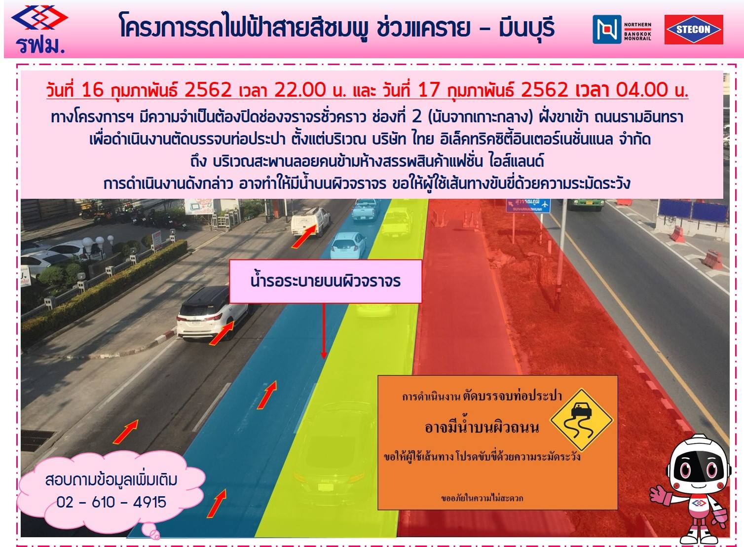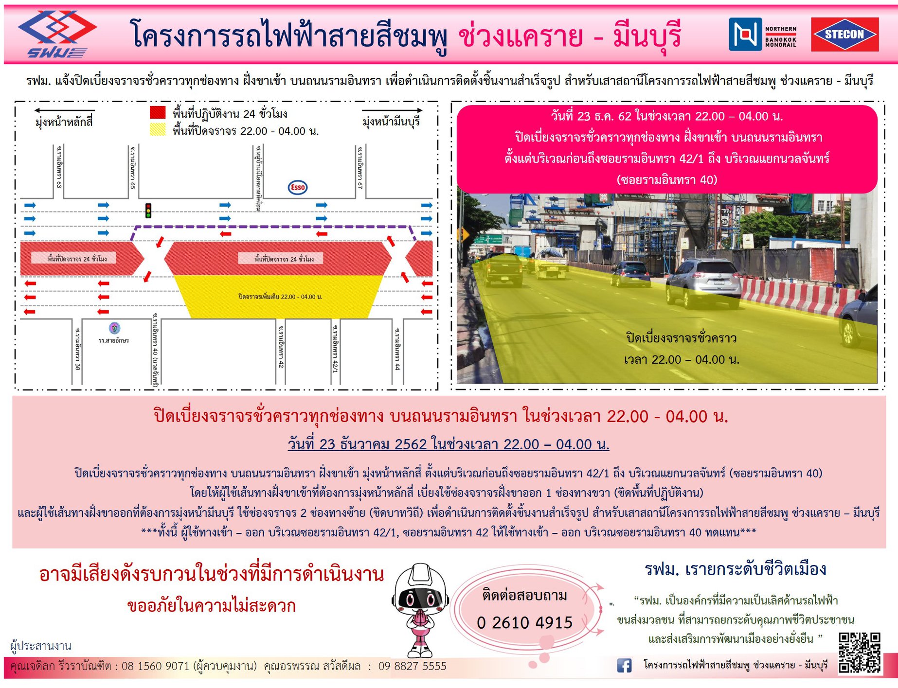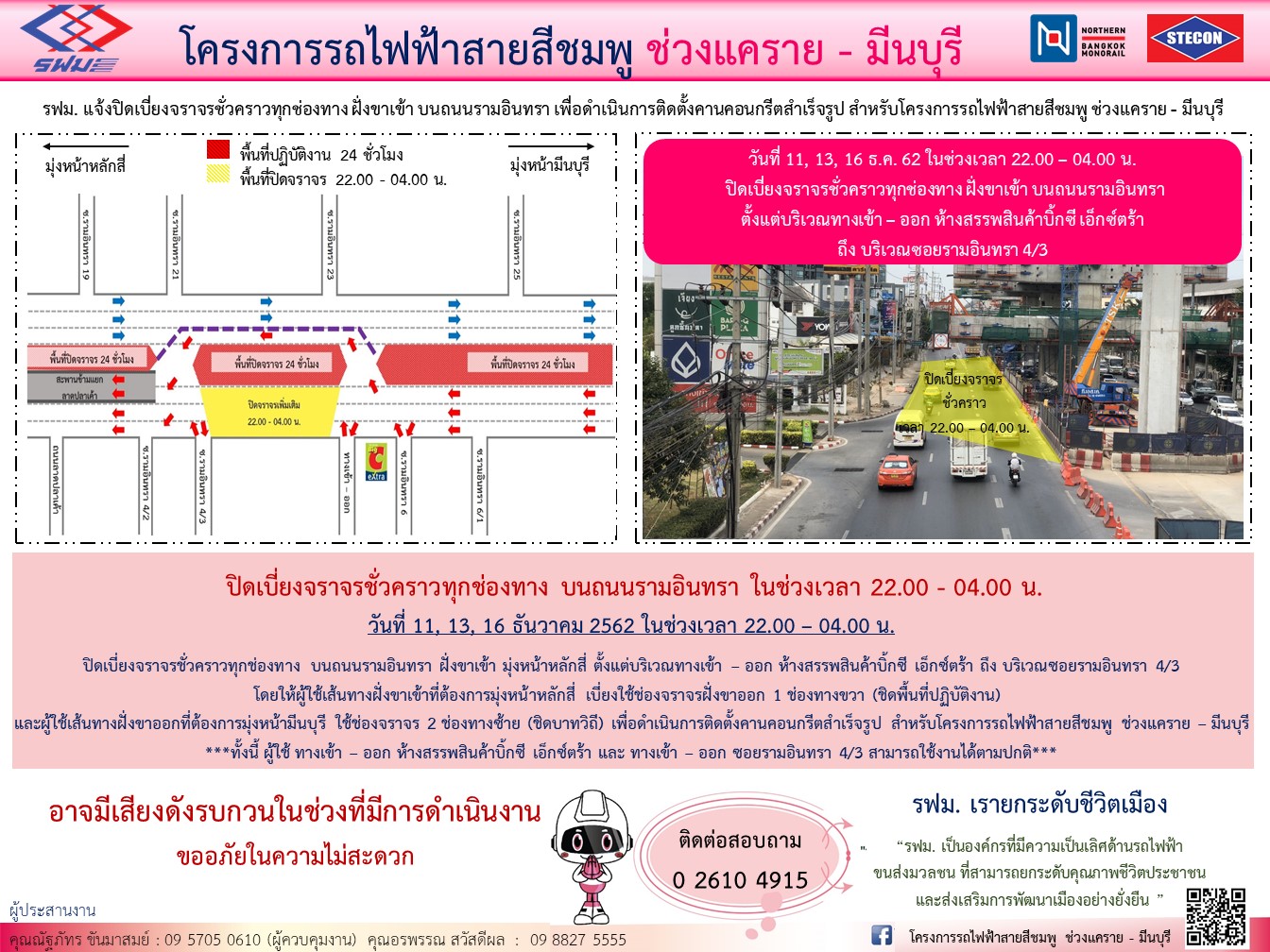 ปิดเบี่ยงจราจรชั่วคราวทุกช่องทาง บนถนนรามอินทรา ฝั่งขาเข้าและฝั่งขาออก เพื่อดำเนินการติดตั้งชิ้นงานสำเร็จรูป สำหรับเสาสถานี วันที่ 22 – 23 ธันวาคม 2562