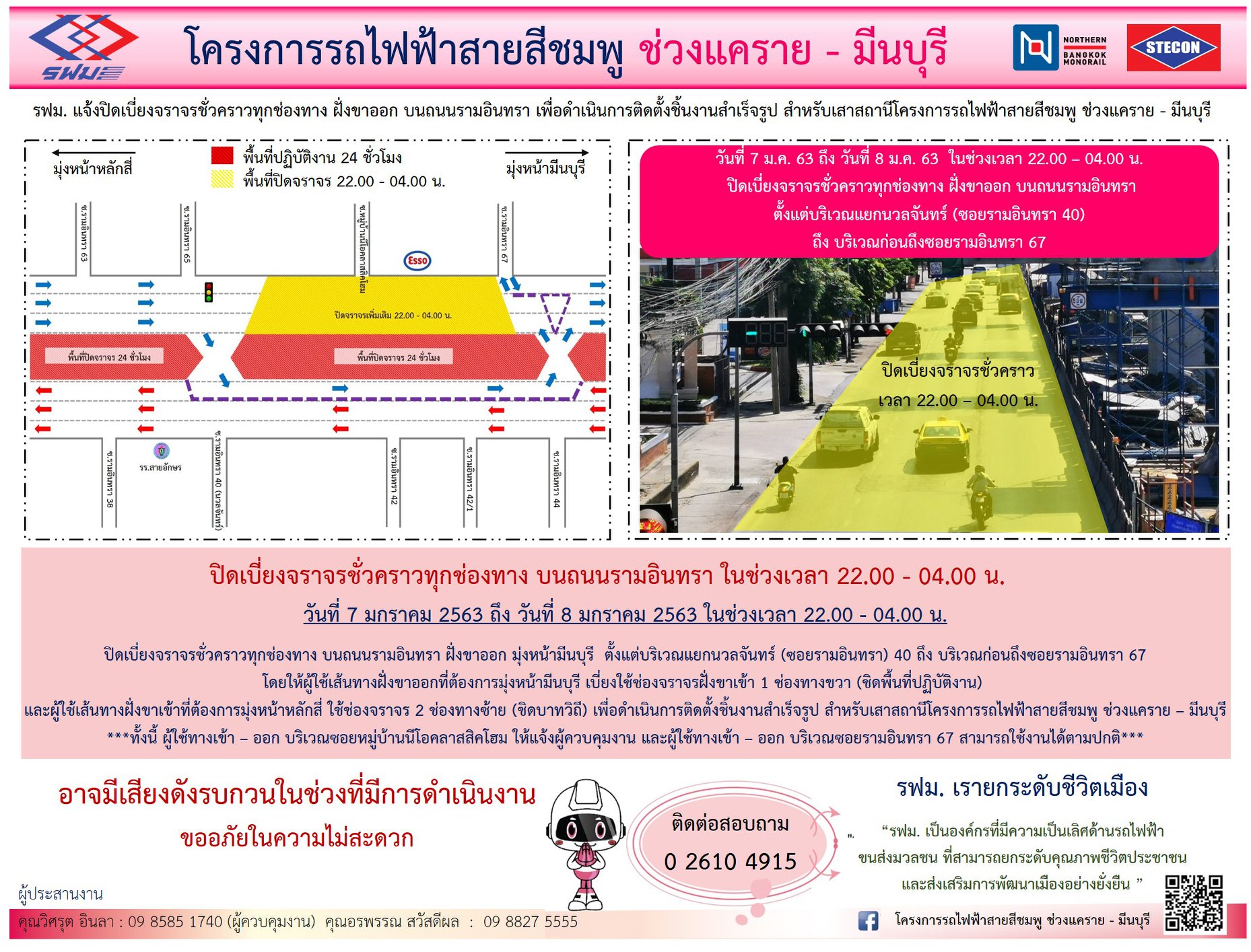 ปิดเบี่ยงจราจรทุกช่องทางชั่วคราว ถนนรามอินทรา ฝั่งขาออก เพื่อดำเนินการติดตั้งชิ้นงานสำเร็จรูป สำหรับเสาสถานีโครงการรถไฟฟ้าสายสีชมพู ช่วงแคราย – มีนบุรี วันที่ 7 – 8 มกราคม 2563