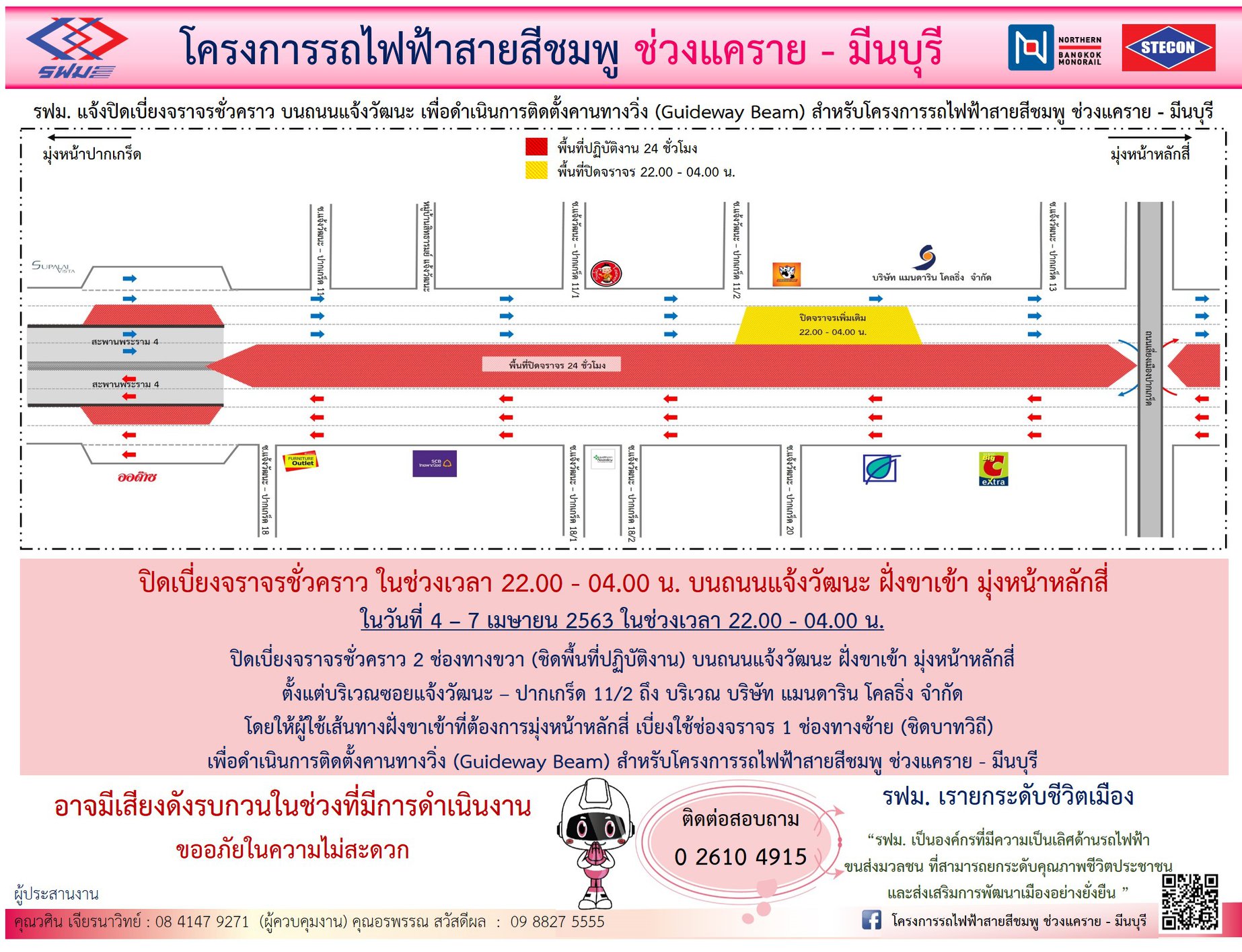ปิดเบี่ยงจราจรชั่วคราว บนถนนแจ้งวัฒนะ ฝั่งขาเข้า เพื่อดำเนินการติดตั้งคานทางวิ่ง (Guideway Beam) วันที่ 4 – 7 เมษายน 2563