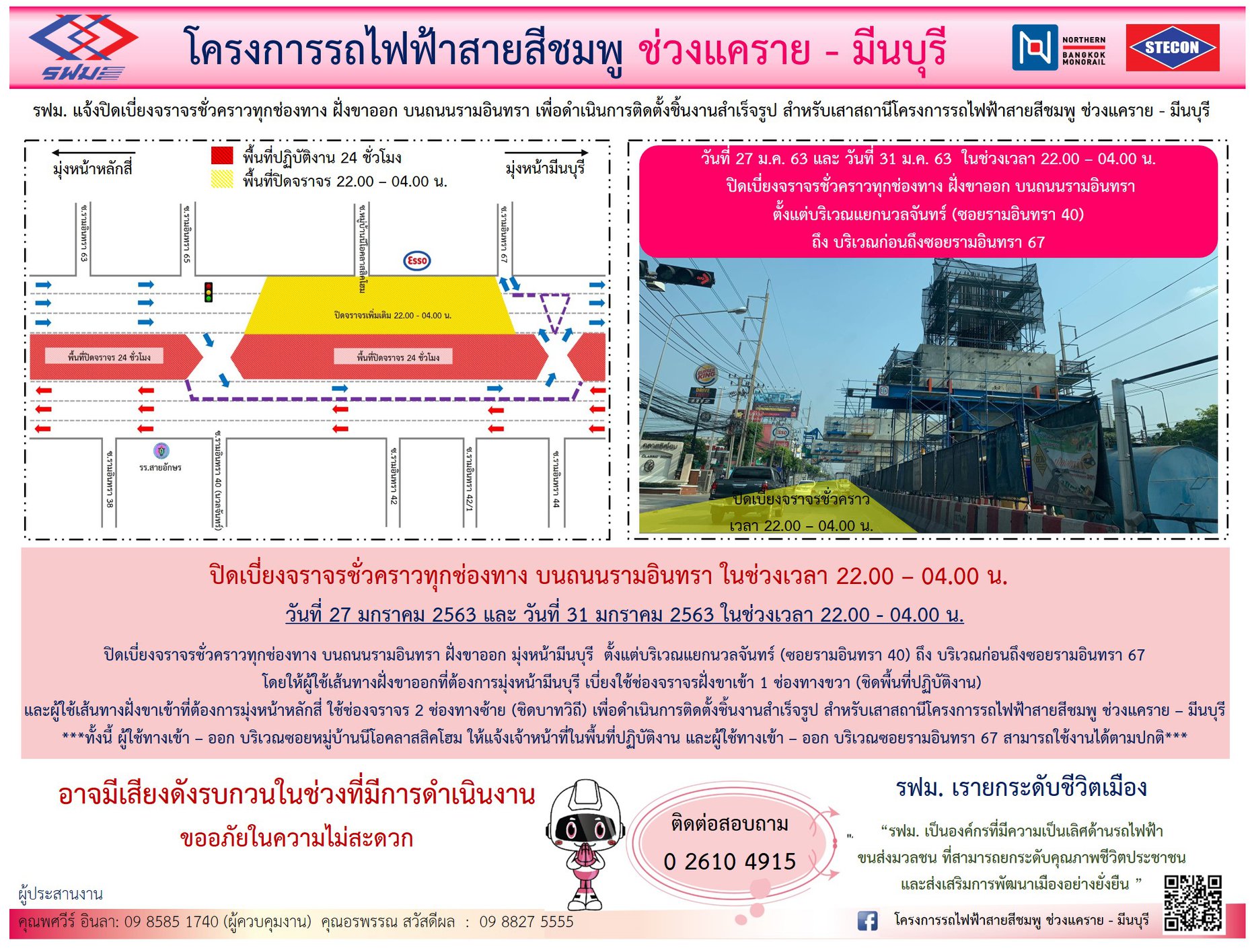 ปิดเบี่ยงจราจรทุกช่องทางชั่วคราว ถนนรามอินทรา ฝั่งขาออก เพื่อดำเนินการติดตั้งชิ้นงานสำเร็จรูป วันที่ 27 มกราคม 2563 และวันที่ 31 มกราคม 2563