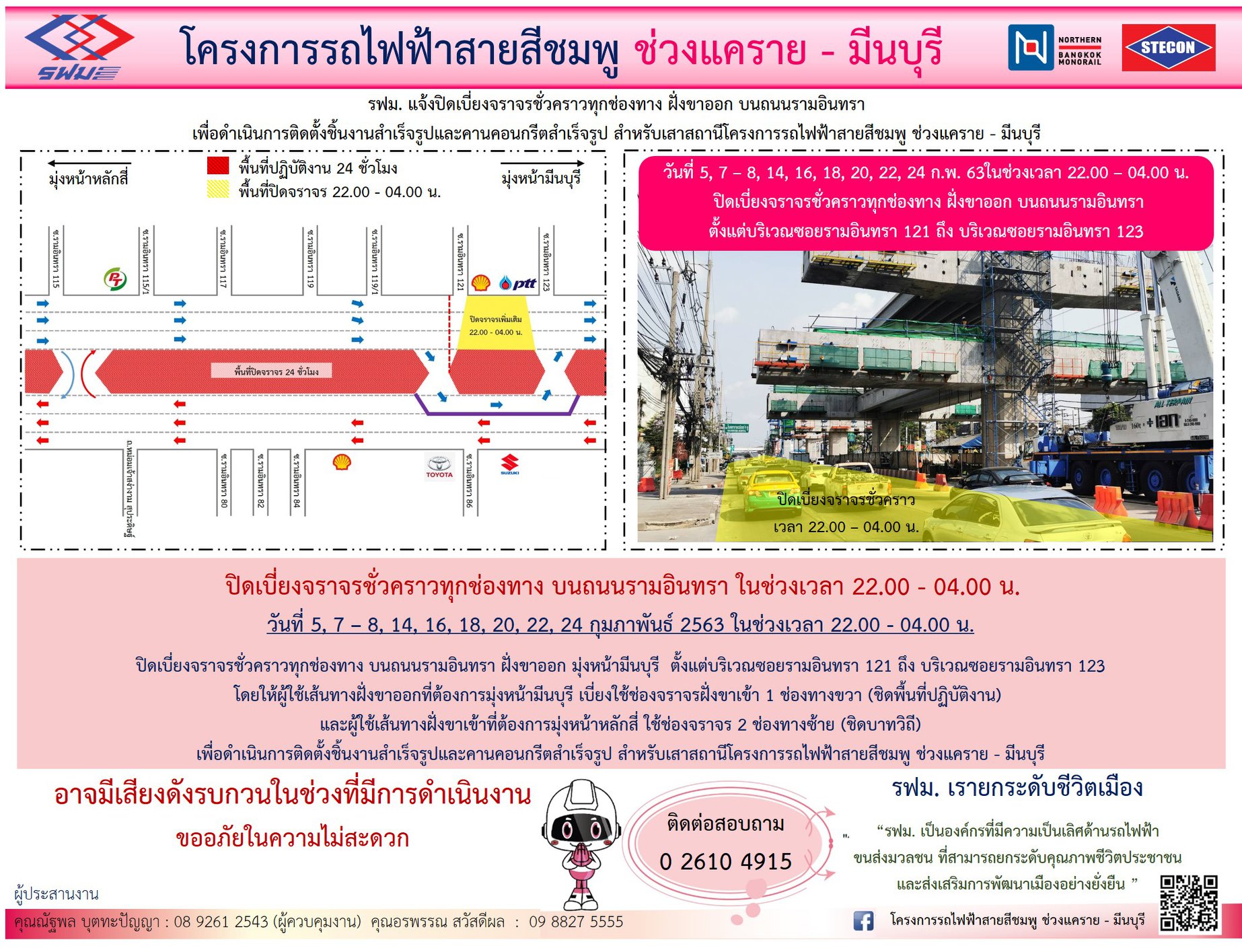 ปิดเบี่ยงจราจรชั่วคราว บนถนนรามอินทรา ฝั่งขาออก เพื่อดำเนินการติดตั้งคานทางวิ่ง (Guideway Beam) วันที่ 23 – 25 กุมภาพันธ์ 2563
