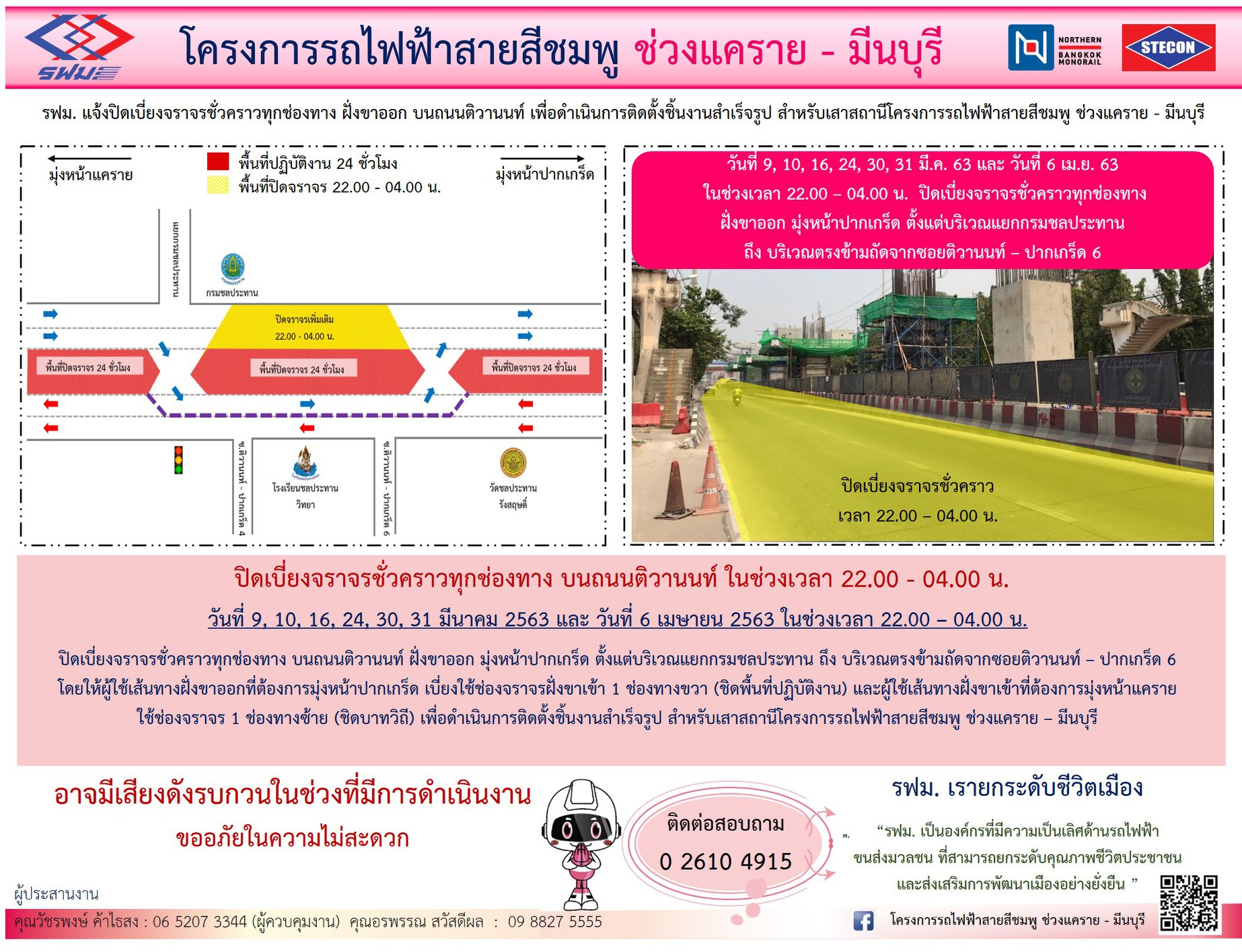 ปิดเบี่ยงจราจรชั่วคราวทุกช่องทาง บนถนนติวานนท์ ฝั่งขาเข้าและฝั่งขาออก เพื่อดำเนินการติดตั้งชิ้นงานสำเร็จรูป สำหรับเสาสถานี วันที่ 9 – 31 มีนาคม 2563 และวันที่ 1 – 10 เมษายน 2563