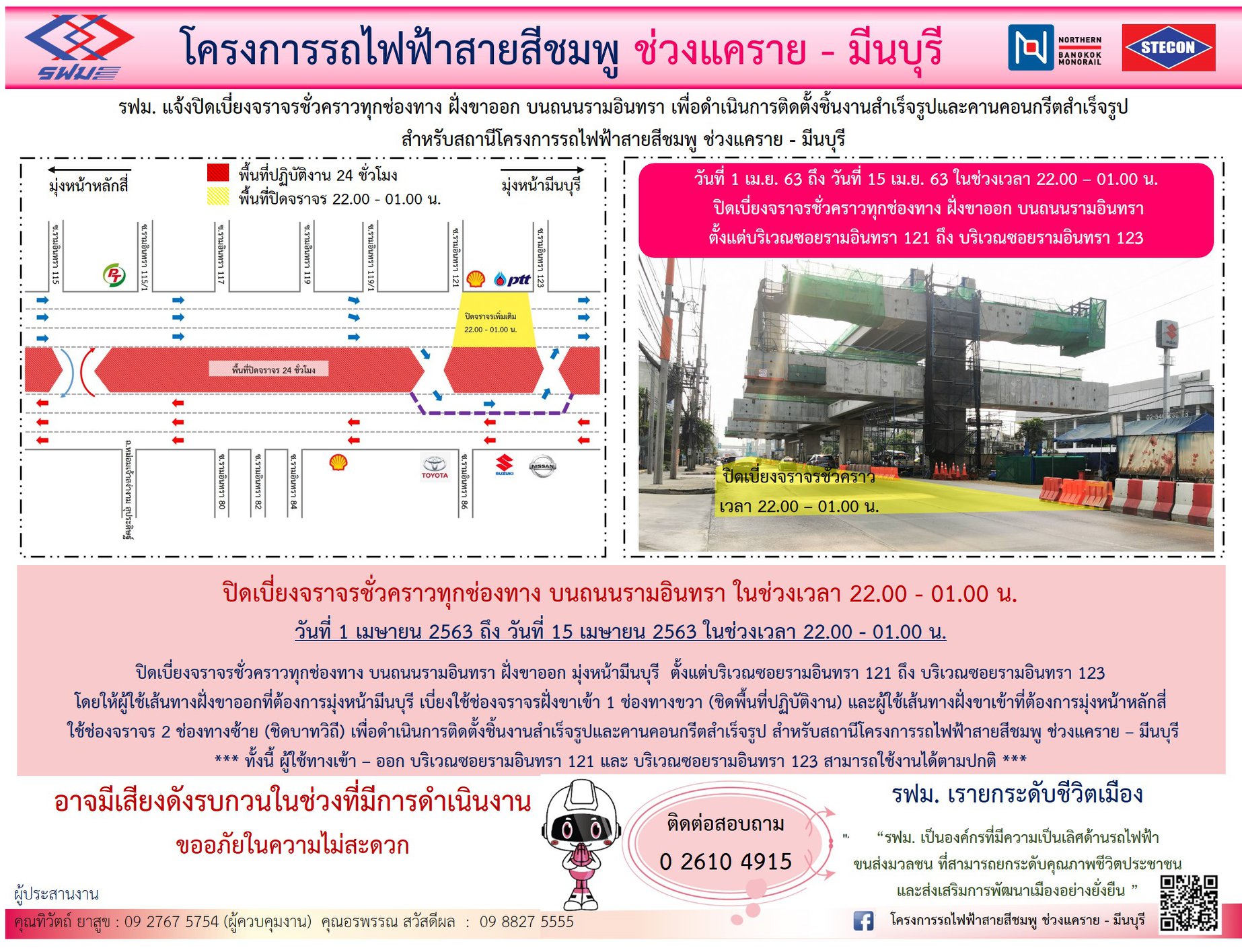 ปิดเบี่ยงจราจรชั่วคราวทุกช่องทาง บนถนนรามอินทรา ฝั่งขาเข้าและฝั่งขาออก เพื่อดำเนินการติดตั้งชิ้นงานสำเร็จรูปและคานคอนกรีตสำเร็จรูป สำหรับสถานี วันที่ 1 – 15 เมษายน 2563