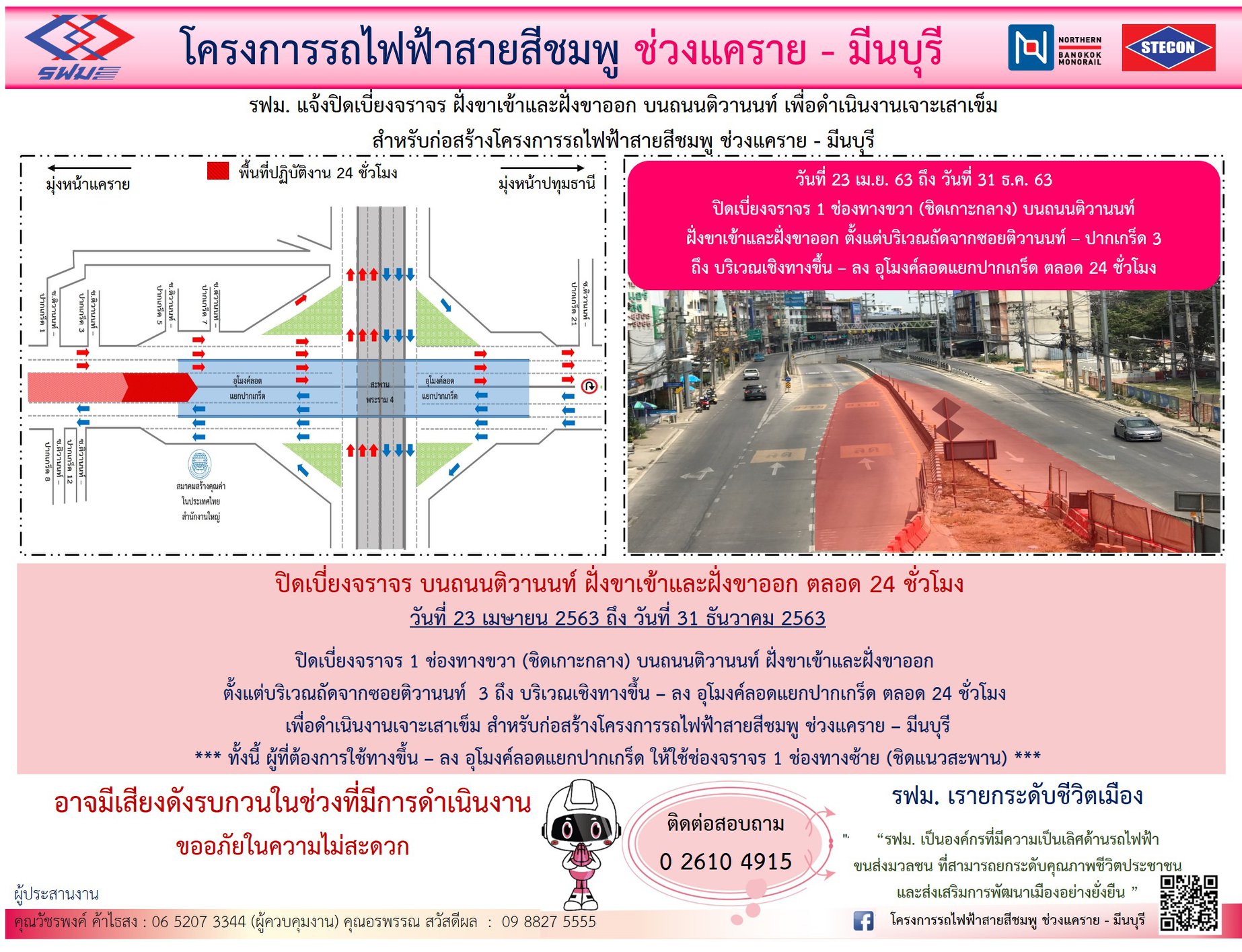 ปิดเบี่ยงจราจร ฝั่งขาเข้าและฝั่งขาออก บนถนนติวานนท์ เพื่อดำเนินงานเจาะเสาเข็ม วันที่ 23 เมษายน – 31 ธันวาคม 2563