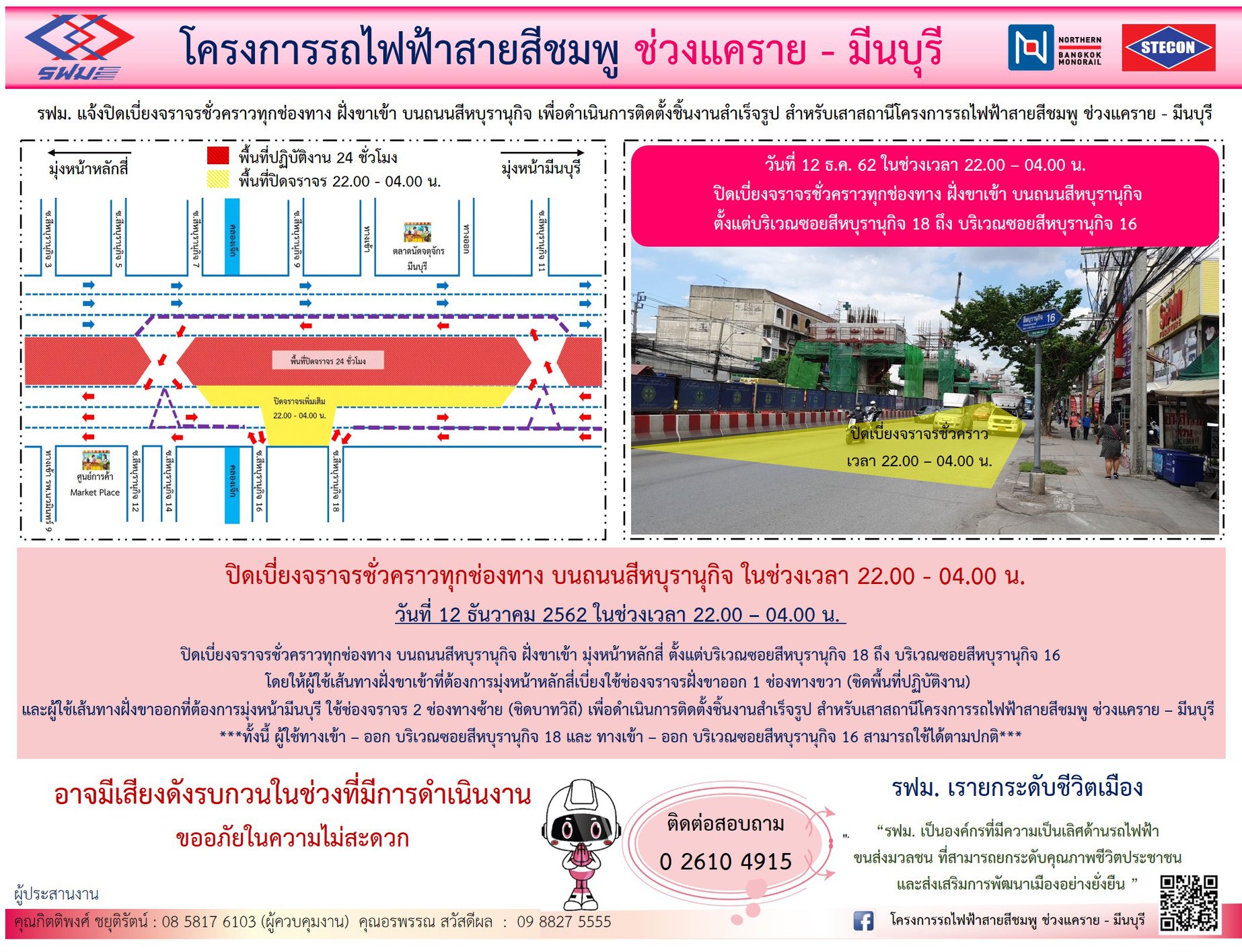ปิดเบี่ยงจราจรชั่วคราวทุกช่องทาง บนถนนรามอินทรา ฝั่งขาออก เพื่อดำเนินการติดตั้งชิ้นงานสำเร็จรูป สำหรับเสาสถานีโครงการรถไฟฟ้าสายสีชมพู ช่วงแคราย – มีนบุรี วันที่ 24 ธันวาคม 2562 ถึงวันที่ 26 ธันวาคม 2562
