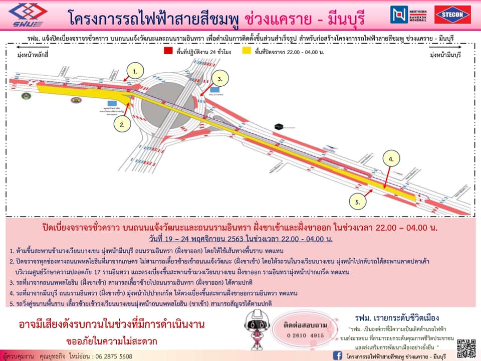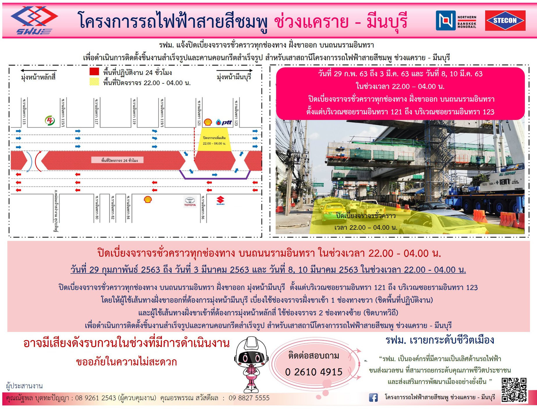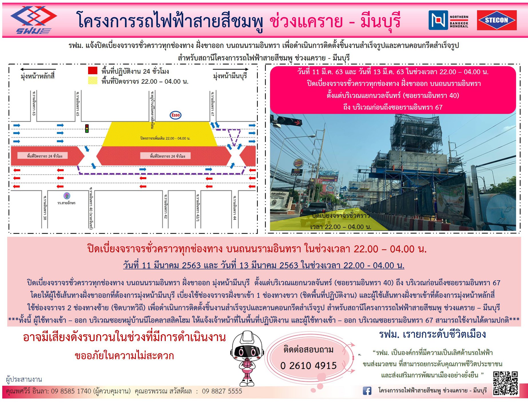 ปิดเบี่ยงจราจรชั่วคราวทุกช่องทาง บนถนนรามอินทรา ฝั่งขาเข้าและฝั่งขาออก เพื่อดำเนินการติดตั้งชิ้นงานสำเร็จรูป สำหรับเสาสถานี วันที่ 26 กุมภาพันธ์ 2563