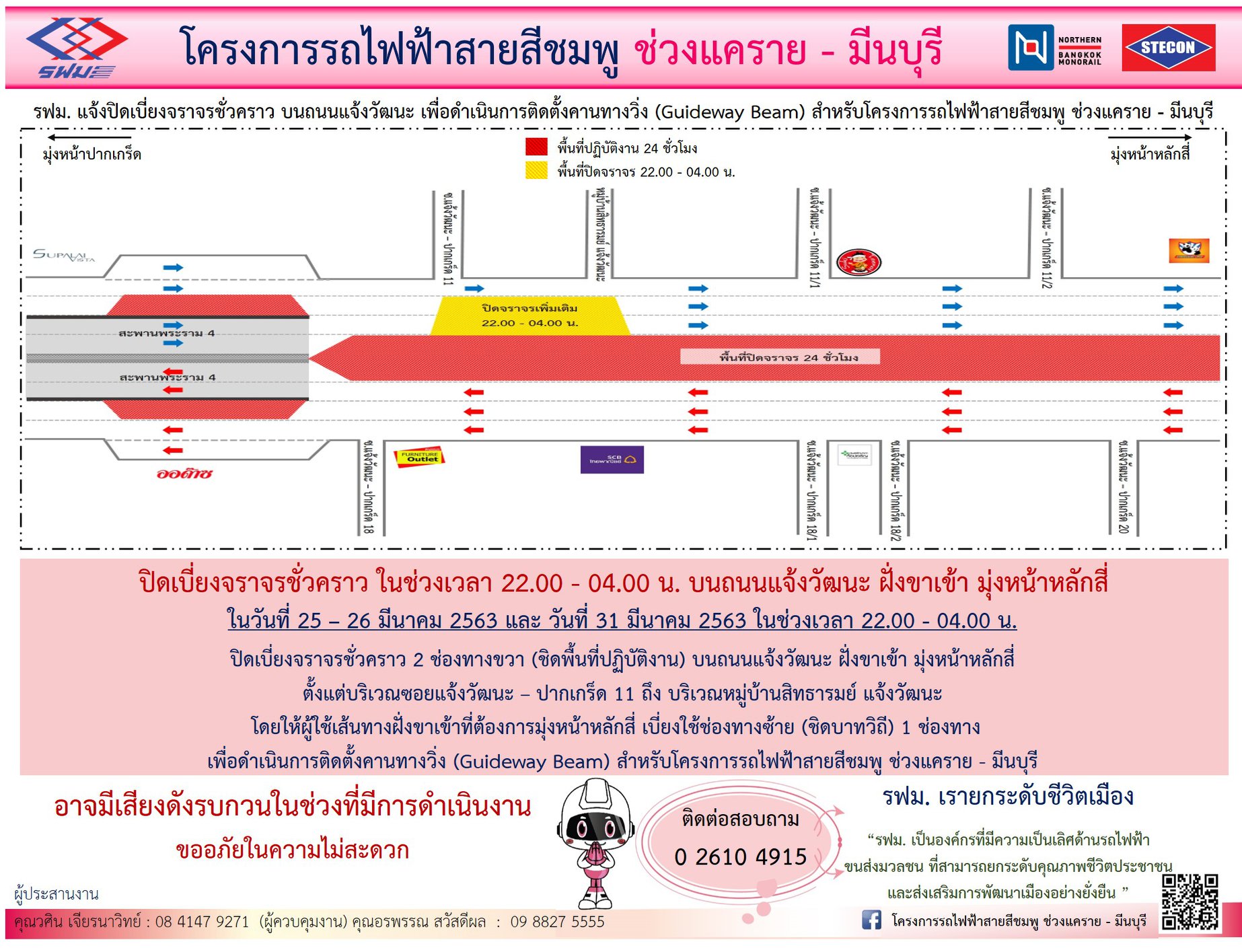 ปิดเบี่ยงจราจรชั่วคราว บนถนนแจ้งวัฒนะ ฝั่งขาเข้า เพื่อดำเนินการติดตั้งคานทางวิ่ง (Guideway Beam) วันที่ 25 – 26 มีนาคม 2563 และวันที่ 31 มีนาคม 2563