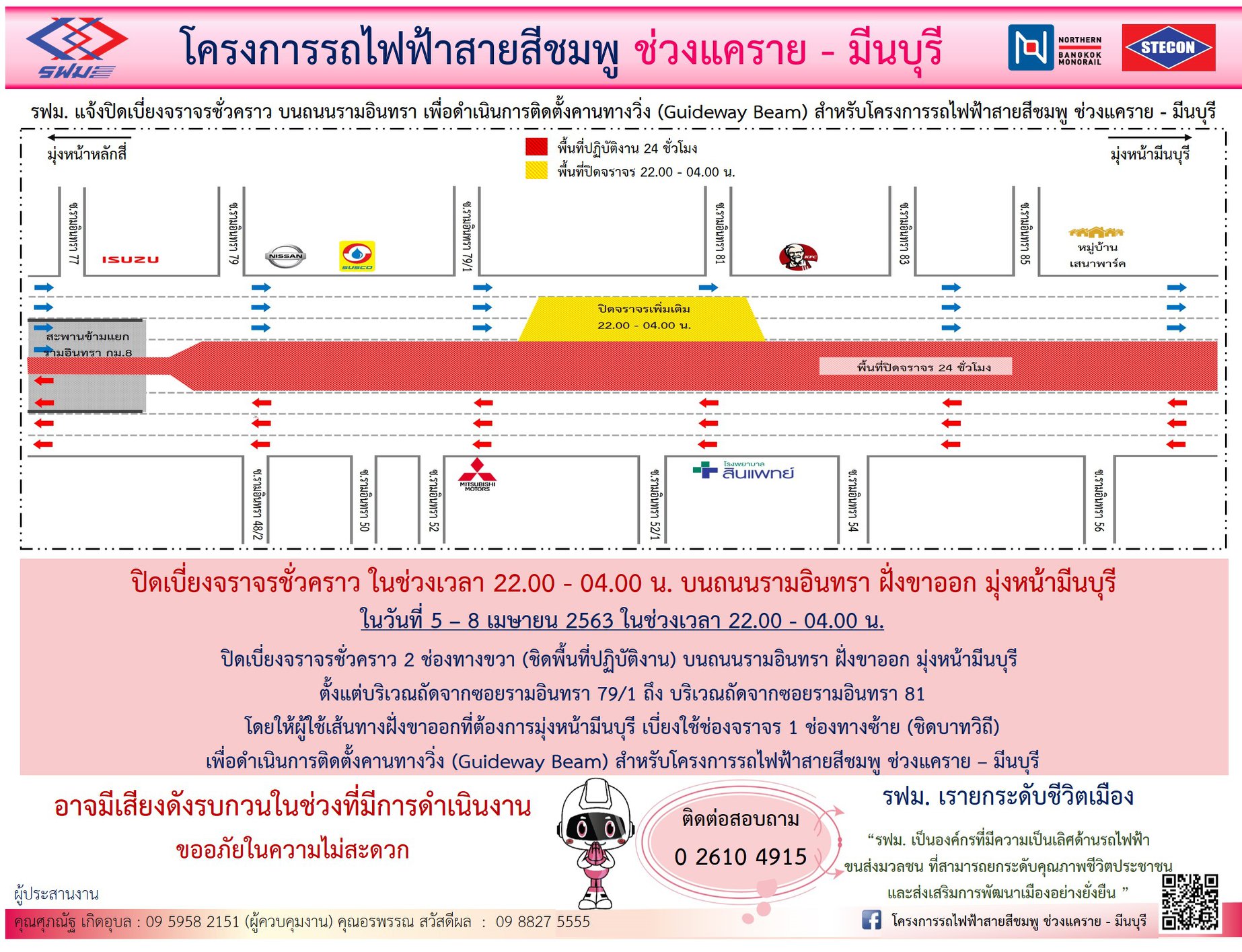 ปิดเบี่ยงจราจรชั่วคราว บนถนนรามอินทรา ฝั่งขาออก เพื่อดำเนินการติดตั้งคานทางวิ่ง (Guideway Beam) วันที่ 1 – 8 เมษายน 2563