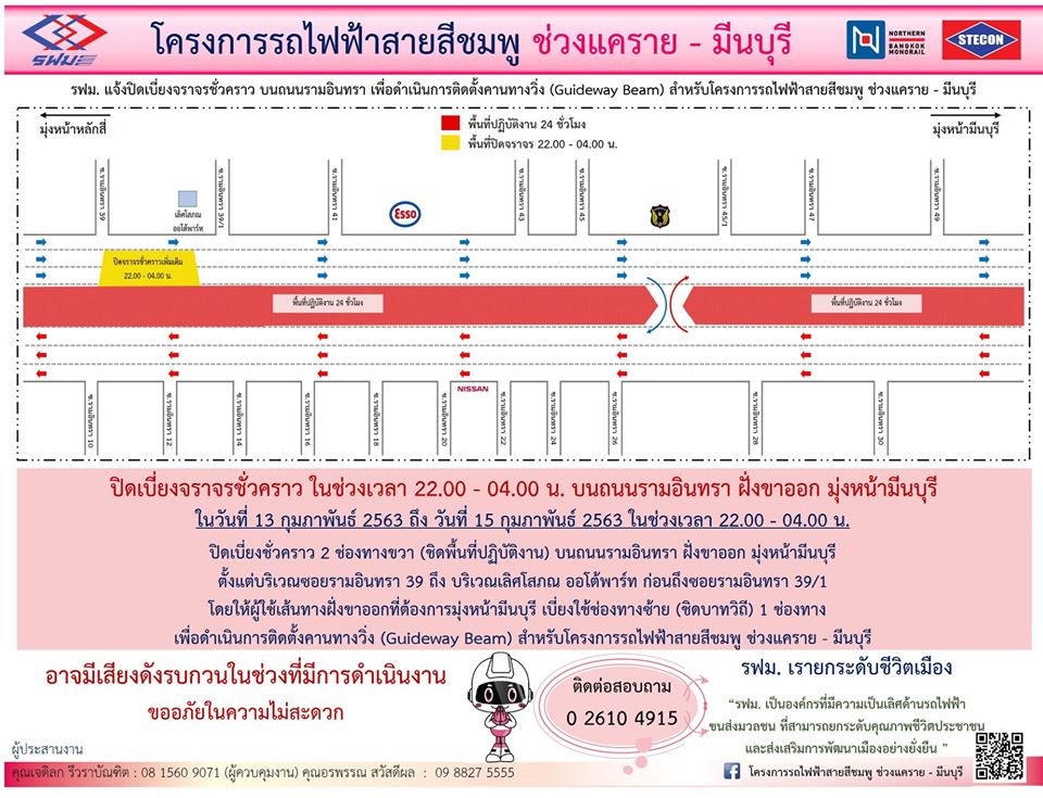 ปิดเบี่ยงจราจรชั่วคราว บนถนนรามอินทรา ฝั่งขาออก เพื่อดำเนินการติดตั้งคานทางวิ่ง (Guideway Beam) วันที่ 13 – 15 กุมภาพันธ์ 2563