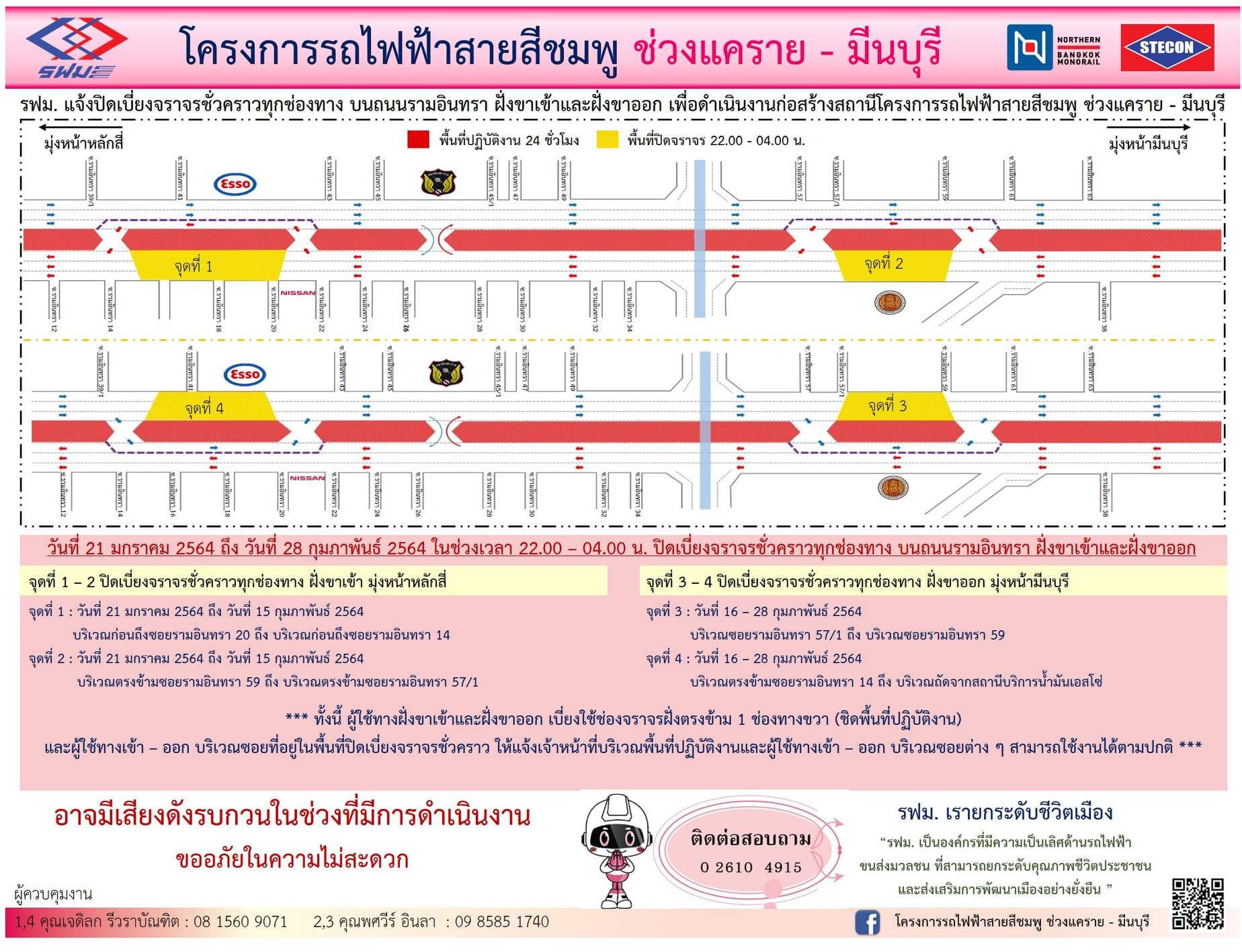 ปิดเบี่ยงจราจรและปิดเบี่ยงจราจรชั่วคราว บนถนนรามอินทรา ฝั่งขาออก มุ่งหน้ามีนบุรี บริเวณถัดจากซอยรามอินทรา 21 ถึง บริเวณถัดจากซอยรามอินทรา 23 วันที่ 21 พฤศจิกายน 2563 ถึง วันที่ 31 มีนาคม 2564 เพื่อดำเนินงานก่อสร้างสถานี