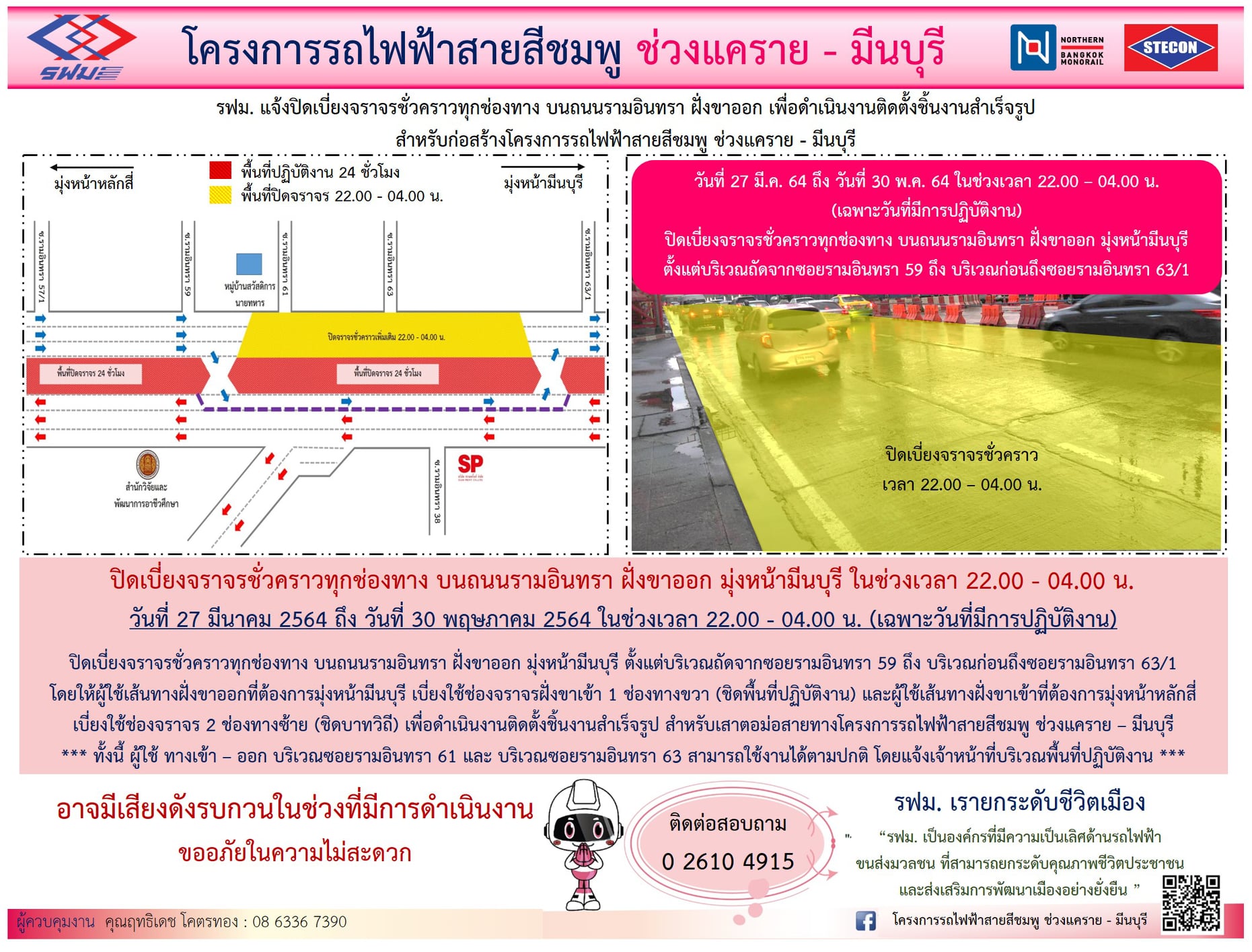 ปิดเบี่ยงจราจรชั่วคราวทุกช่องทาง ถนนรามอินทรา ฝั่งขาออก มุ่งหน้ามีนบุรี บริเวณถัดจากซอยรามอินทรา 59 ถึง บริเวณก่อนถึงซอยรามอินทรา 63/1 วันที่ 27 มีนาคม 2564 ถึง วันที่ 30 พฤษภาคม 2564 เวลา 22.00 – 04.00 น. เพื่อดำเนินงานก่อสร้าง