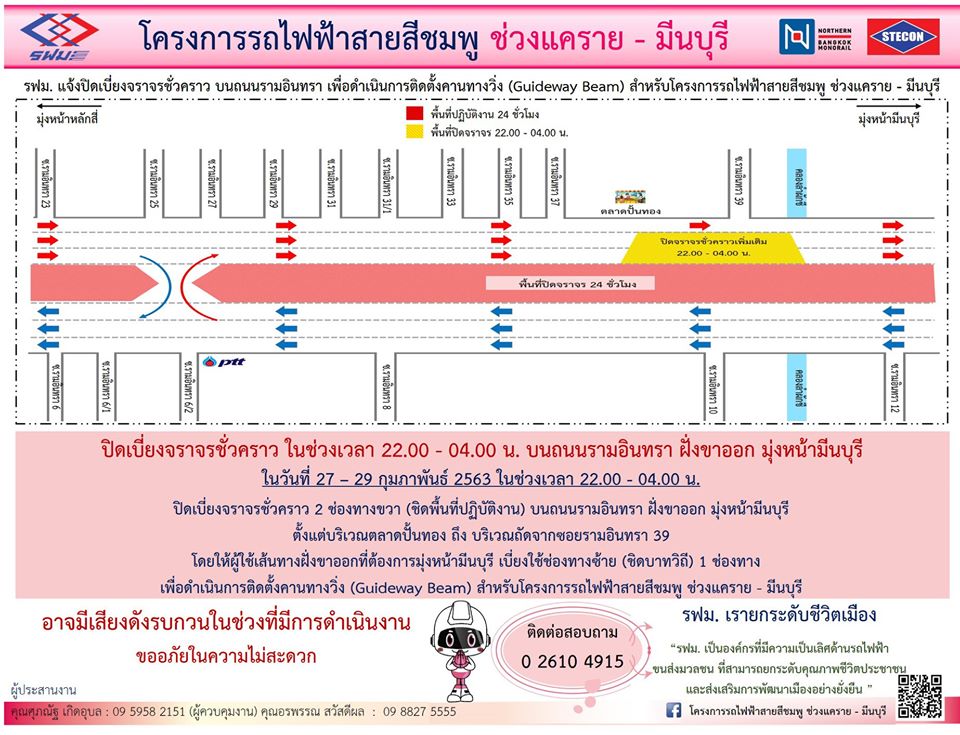 ปิดเบี่ยงจราจรชั่วคราว บนถนนรามอินทรา ฝั่งขาออก เพื่อดำเนินการติดตั้งคานทางวิ่ง (Guideway Beam) วันที่ 27 – 29 กุมภาพันธ์ 2563