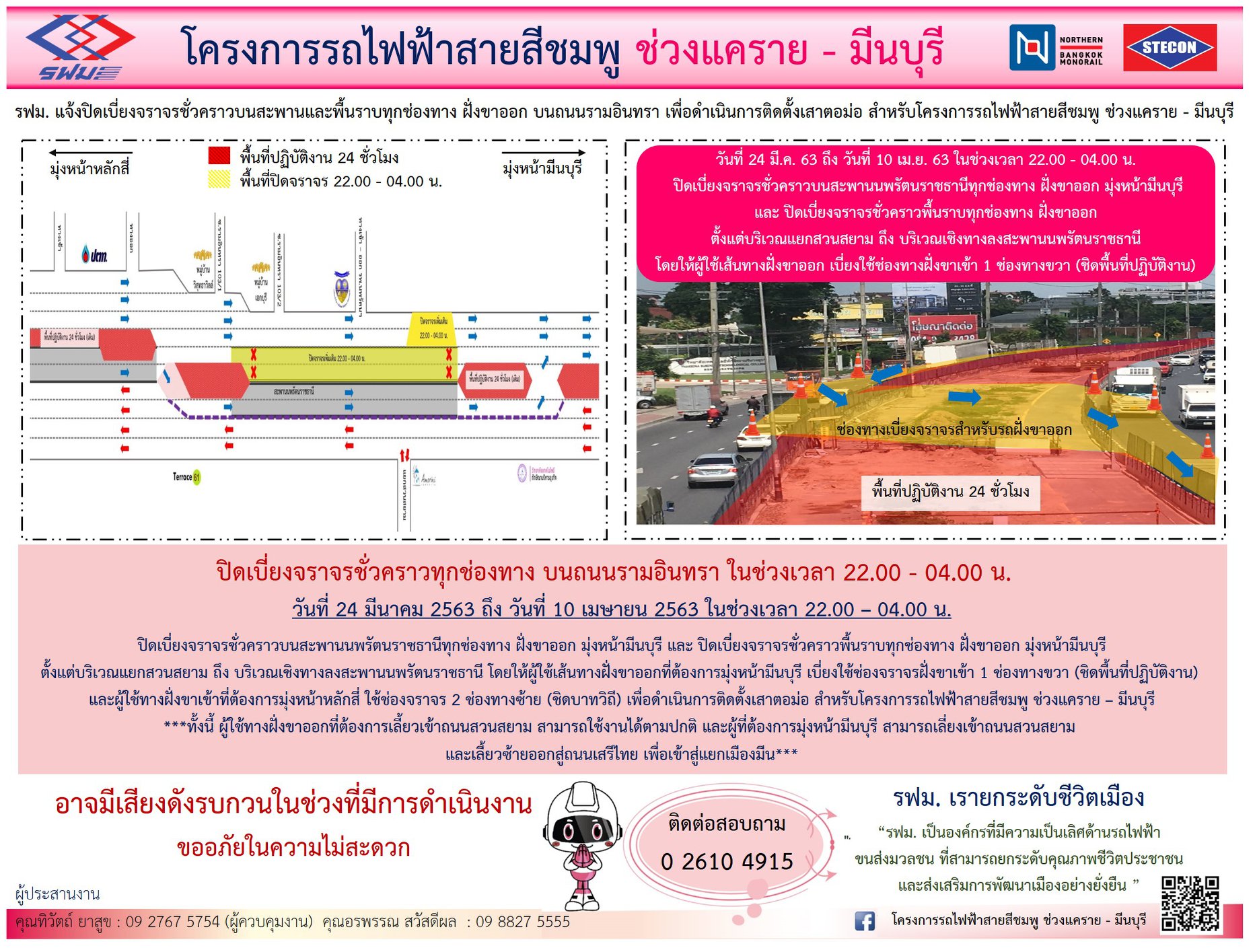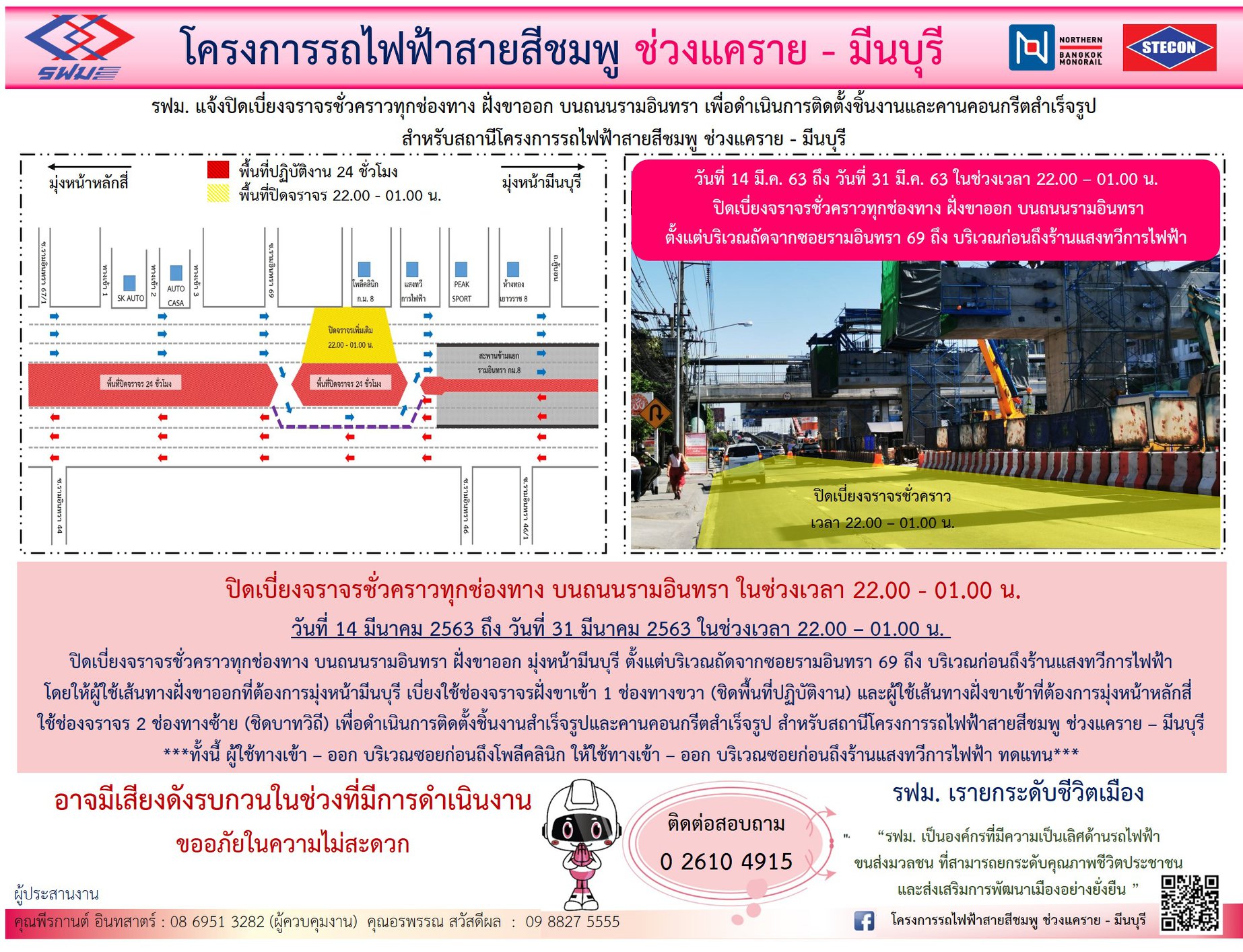 ปิดเบี่ยงจราจรชั่วคราวทุกช่องทาง บนถนนรามอินทรา ฝั่งขาเข้าและฝั่งขาออก เพื่อดำเนินการติดตั้งชิ้นงานสำเร็จรูปและคานคอนกรีตสำเร็จรูป สำหรับสถานี วันที่ 14 – 31 มีนาคม 2563