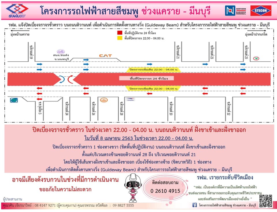 ปิดเบี่ยงจราจรทุกช่องทางชั่วคราว บนถนนรามอินทรา ฝั่งขาเข้า เพื่อดำเนินการติดตั้งชิ้นงานสำเร็จรูป สำหรับเสาสถานี วันที่ 22 – 24 กุมภาพันธ์ 2563