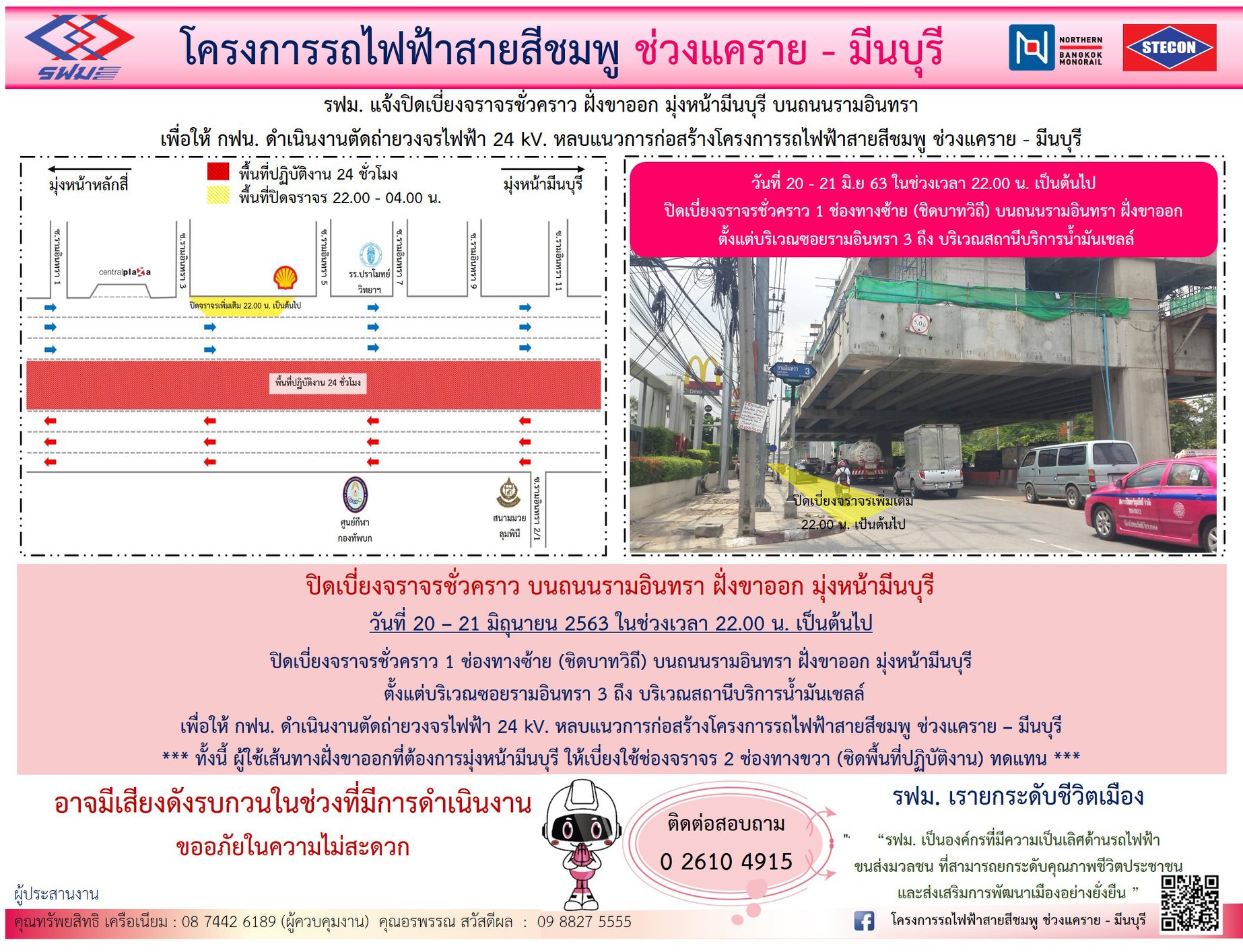 ปิดเบี่ยงจราจรชั่วคราว บนถนนรามอินทรา ฝั่งขาออก มุ่งหน้ามีนบุรี ตั้งแต่บริเวณซอยรามอินทรา 3 ถึง บริเวณสถานีบริการน้ำมันเชลล์ เพื่อให้ กฟน. ดำเนินงานตัดถ่ายวงจรไฟฟ้า 24 kV. หลบแนวการก่อสร้าง วันที่ 20 – 21 มิถุนายน 2563 เวลา 22.00 น. เป็นต้นไป